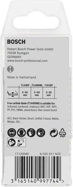 - Také obsahuje jeden ukázkový plátek vyrobený nejmodernější karbidovou technologií Bosch.