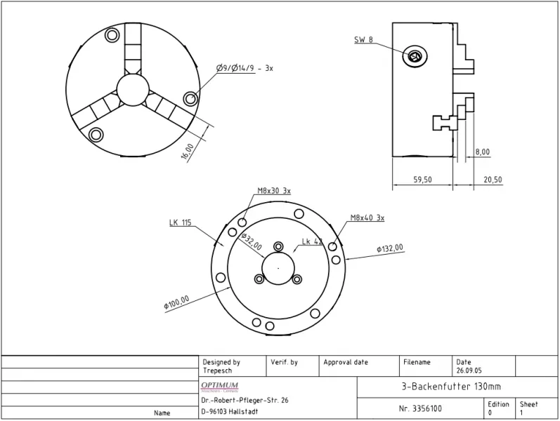 3-čelisťové sklíčidlo 125 mm pro RT 150 3356100 Optimum