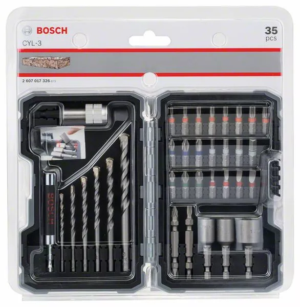 - 35kusová souprava vrtáků a šroubovacích nástavců je umístěna v praktickém a robustním pouzdru, jež poskytuje dobrý přehled o svém obsahu a bezpečné uložení a přenášení.