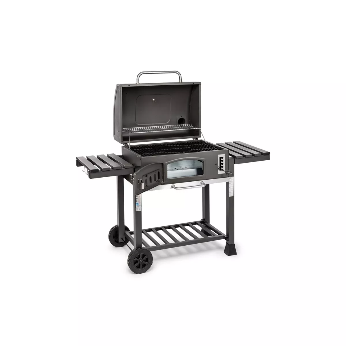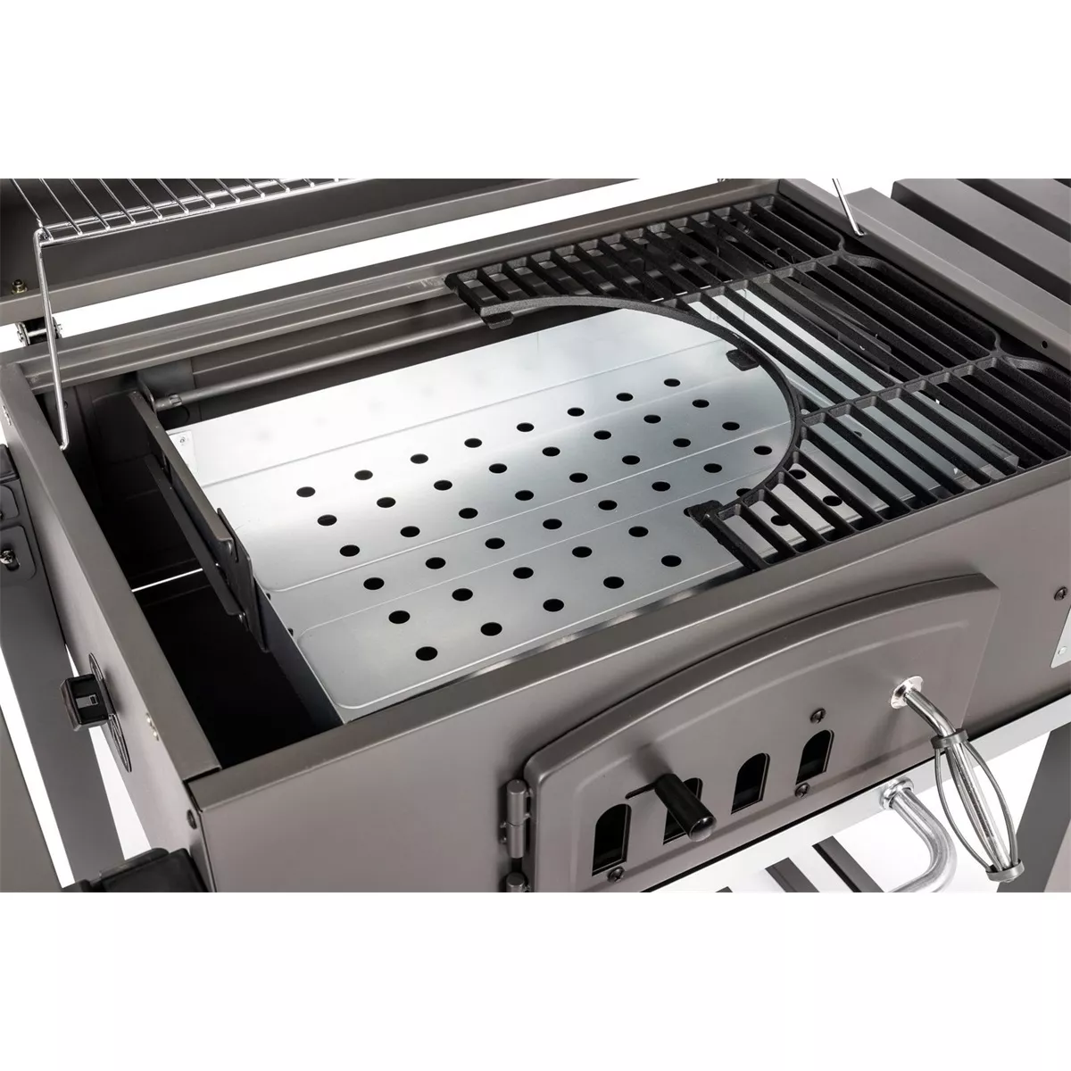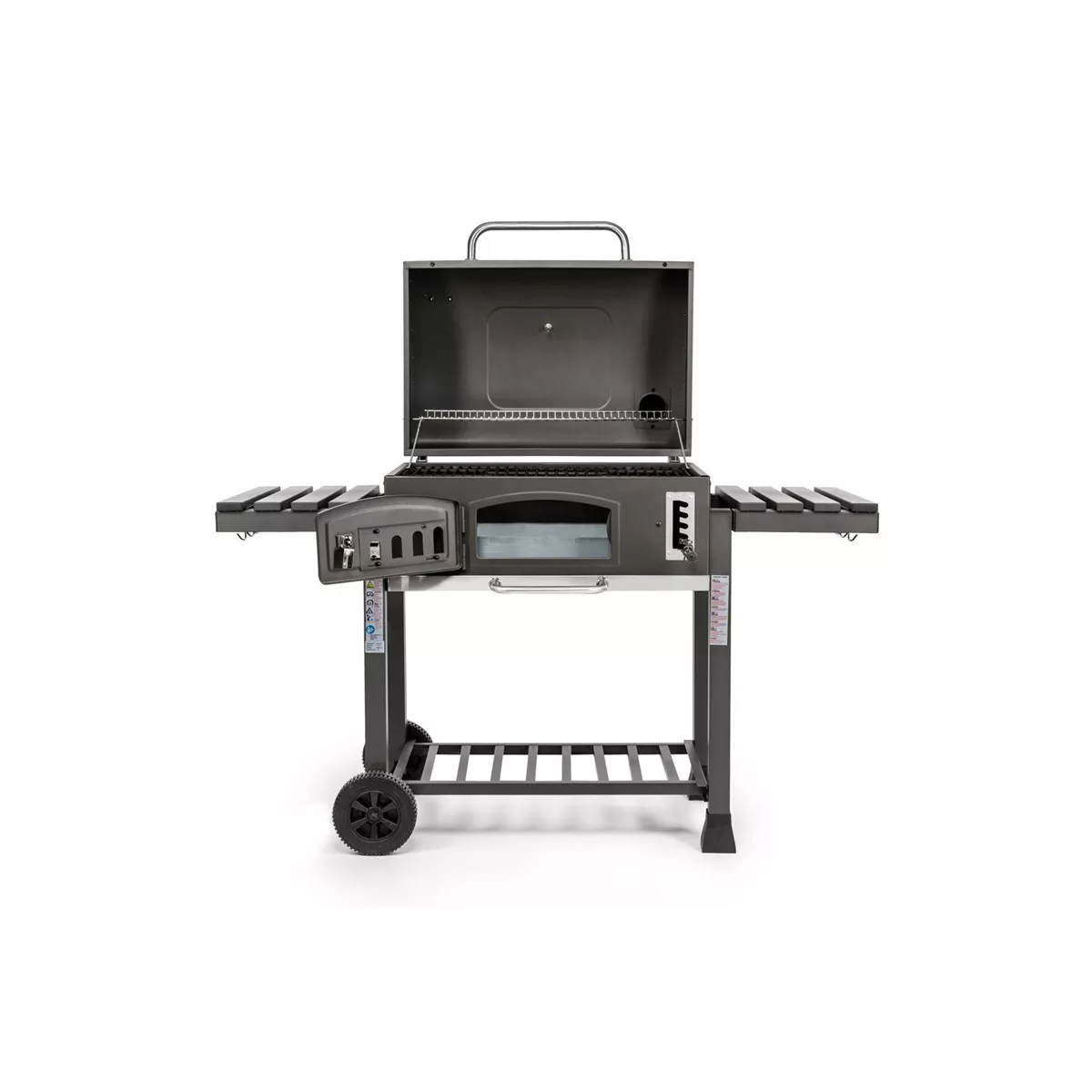 - Kompletně vybavený velký gril vhodný i pro velké párty. S tímto grilem během chvilky snadno pohostíte až 14 osob. Tento gril s nádherným klasickým designem se velmi jednoduše obsluhuje a má řadu praktických doplňků. Kovové plochy grilu jsou opatřeny kvalitní vrstvou ohnivzdorné práškové barvy, velký grilovací rošt je z litiny opatřené odolným smaltem a má vyjímatelnou kruhovou část (Grid in Grid systém) a přídavný výklopný rošt. Na přídavném roštu můžete pokrmy udržovat ve správné teplotě anebo v kombinaci s víkem využít možnosti nepřímého grilování. Regulace teploty je možná několika způsoby. Buď pomocí 2 ventilačních otvorů ve víku a 2 v těle grilu anebo pomocí výškově regulovatelné vany na uhlí. Rozžhavené uhlí tak pomocí nastavovací páky podle potřeby lehce přibližujete nebo oddalujete od grilovaného pokrmu. Pro snadné přikládání i během grilování je tělo grilu opatřeno v čele velkými dvířky. Ve spodní části grilu je potom odnímatelný popelník. Pro sledování teploty je ve víku grilu umístěn teploměr. Z dalších praktických doplňků potom můžeme jmenovat dvě praktické odkládací boční plochy, háčky na zavěšení grilovacího náčiní, integrovaný otvírač na láhve a ještě jednu odkládací polici ve spodní části grilu. Gril je díky čtyřem pevným nohám velmi stabilní a díky dvěma kolečkům se s ním i snadno manipuluje. Pro usnadnění skladování jdou obě boční police snadno demontovat.