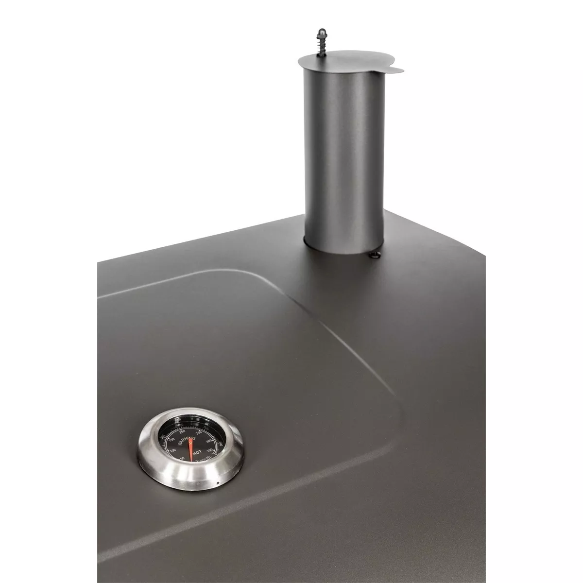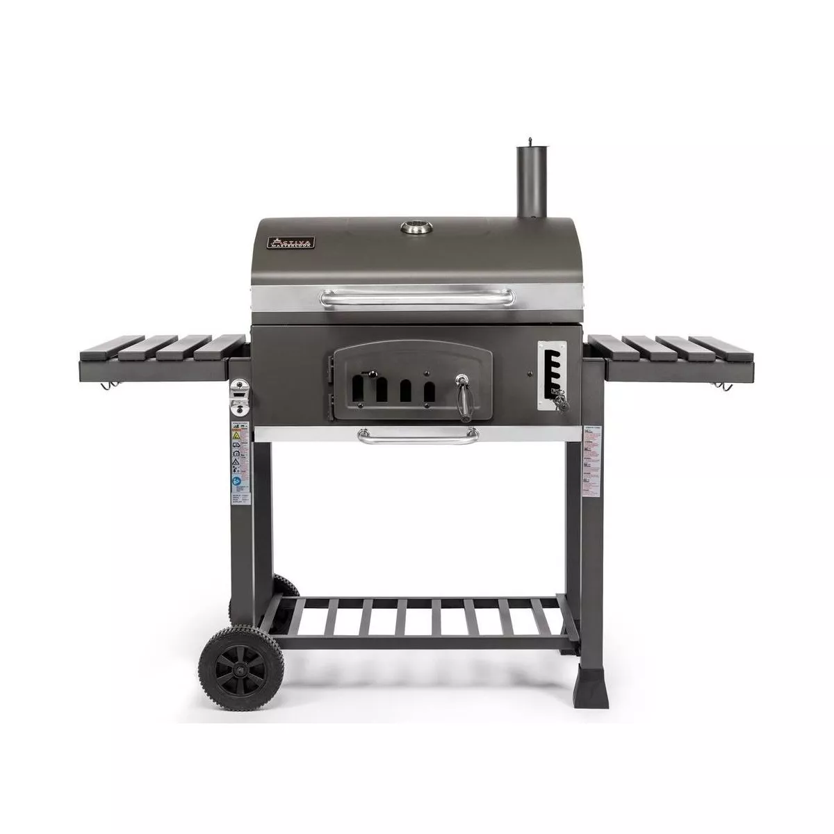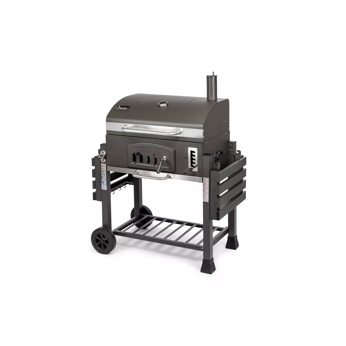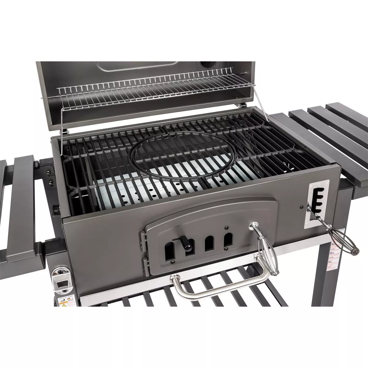- Kompletně vybavený velký gril vhodný i pro velké párty. S tímto grilem během chvilky snadno pohostíte až 14 osob. Tento gril s nádherným klasickým designem se velmi jednoduše obsluhuje a má řadu praktických doplňků. Kovové plochy grilu jsou opatřeny kvalitní vrstvou ohnivzdorné práškové barvy, velký grilovací rošt je z litiny opatřené odolným smaltem a má vyjímatelnou kruhovou část (Grid in Grid systém) a přídavný výklopný rošt. Na přídavném roštu můžete pokrmy udržovat ve správné teplotě anebo v kombinaci s víkem využít možnosti nepřímého grilování. Regulace teploty je možná několika způsoby. Buď pomocí 2 ventilačních otvorů ve víku a 2 v těle grilu anebo pomocí výškově regulovatelné vany na uhlí. Rozžhavené uhlí tak pomocí nastavovací páky podle potřeby lehce přibližujete nebo oddalujete od grilovaného pokrmu. Pro snadné přikládání i během grilování je tělo grilu opatřeno v čele velkými dvířky. Ve spodní části grilu je potom odnímatelný popelník. Pro sledování teploty je ve víku grilu umístěn teploměr. Z dalších praktických doplňků potom můžeme jmenovat dvě praktické odkládací boční plochy, háčky na zavěšení grilovacího náčiní, integrovaný otvírač na láhve a ještě jednu odkládací polici ve spodní části grilu. Gril je díky čtyřem pevným nohám velmi stabilní a díky dvěma kolečkům se s ním i snadno manipuluje. Pro usnadnění skladování jdou obě boční police snadno demontovat.