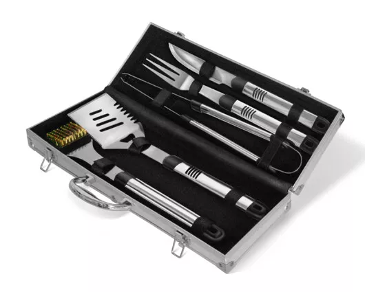 - Luxusní sada grilovacího nářadí Activa Vám usnadní manipulaci s grilovanými pokrmy a usnadní Vám udržovat rošt v čistotě během grilování. Je vyrobena z nerezové oceli, takže Vám vydrží velmi dlouho. Jednotlivé nářadí má velmi moderní a propracovaný design pro pohodlné ovládání. Sada obsahuje vidlici, obracečku, kleště nůž a mosazný kartáč. Nechybí možnost zavěšení na háčky. Celá sada se dodává v praktickém hliníkovém kufříku.
