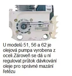 - U modelů 51, 56 a 62 je olejová pumpa vyrobena z oceli. Zároveň se dá u ní regulovat průtok dávkování oleje pro správné mazání řetězu.