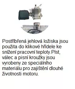 - Ke standardní výbavě těchto strojů patří digitální zapalování, dekompresní ventil, primer a účinný antivibrační systém. Píst je osazen dvěma pístními kroužky a čep klikový spolu s pístním jsou usazeny na postříbřených jehlových ložiscích.