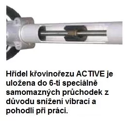 - Hřídel křovinořezu ACTIVE je uložena do 6-ti speciálně samomazných průchodek z důvodu snížení vibrací a pohodlí při práci.