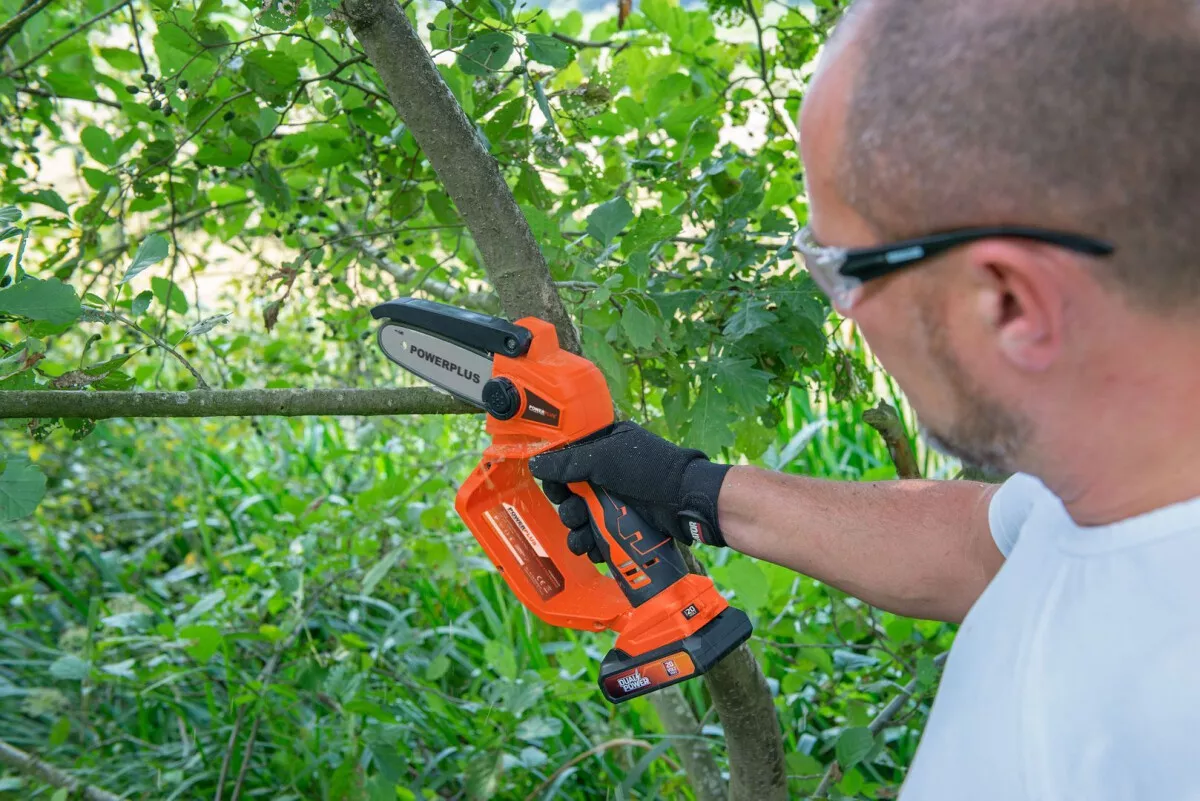 - Díky kompaktnímu designu můžete tuto prořezávací Aku pilu 20V POWDPG7572 od PowerPlus ovládat pouze jednou rukou.