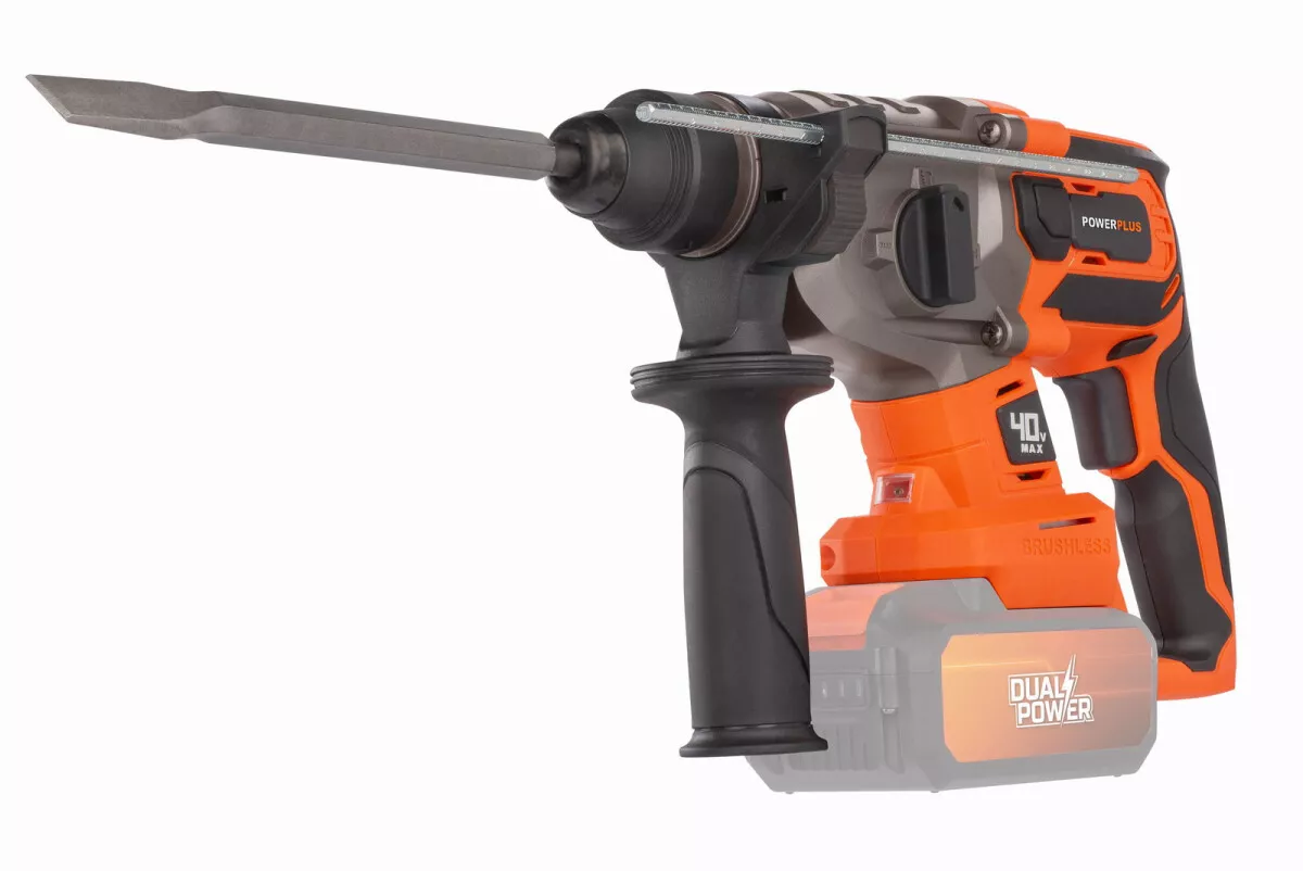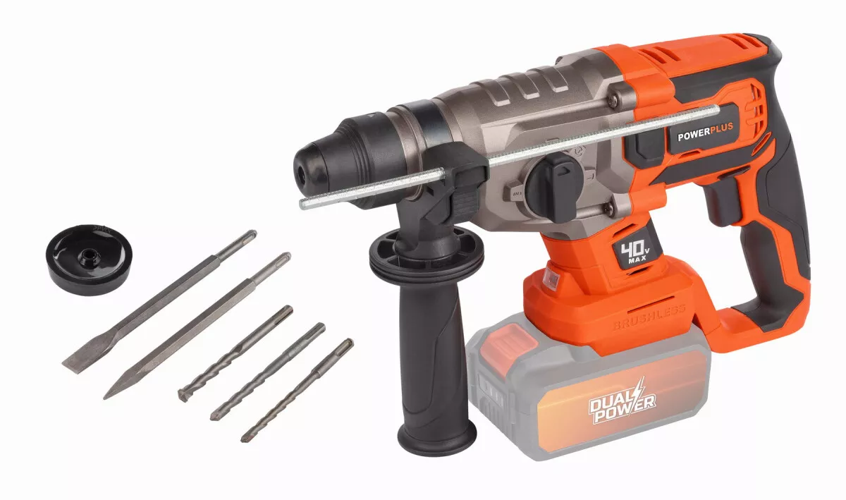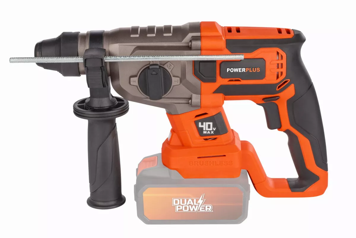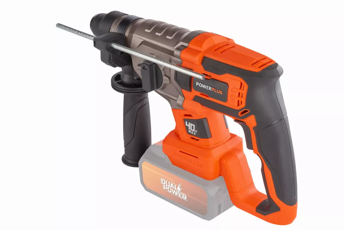 - Toto aku vrtací kladivo 40V POWDP15680 od společnosti Powerplus nabízí 4 různé funkce: vrtání, příklepové vrtání, sekání a otáčení sekáče.