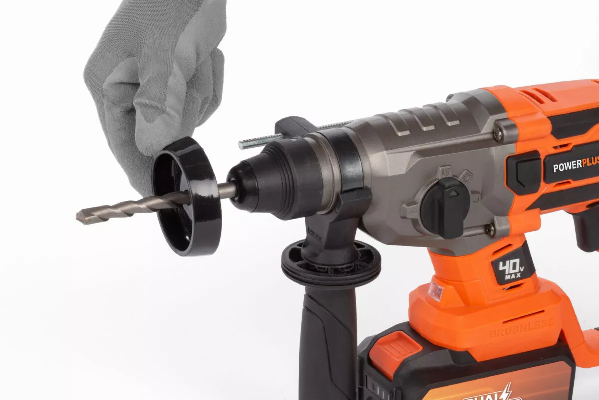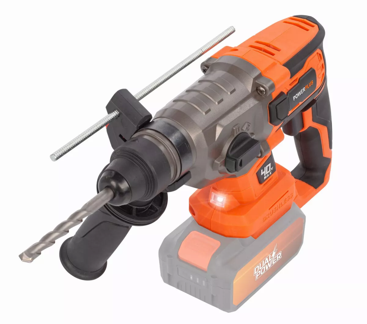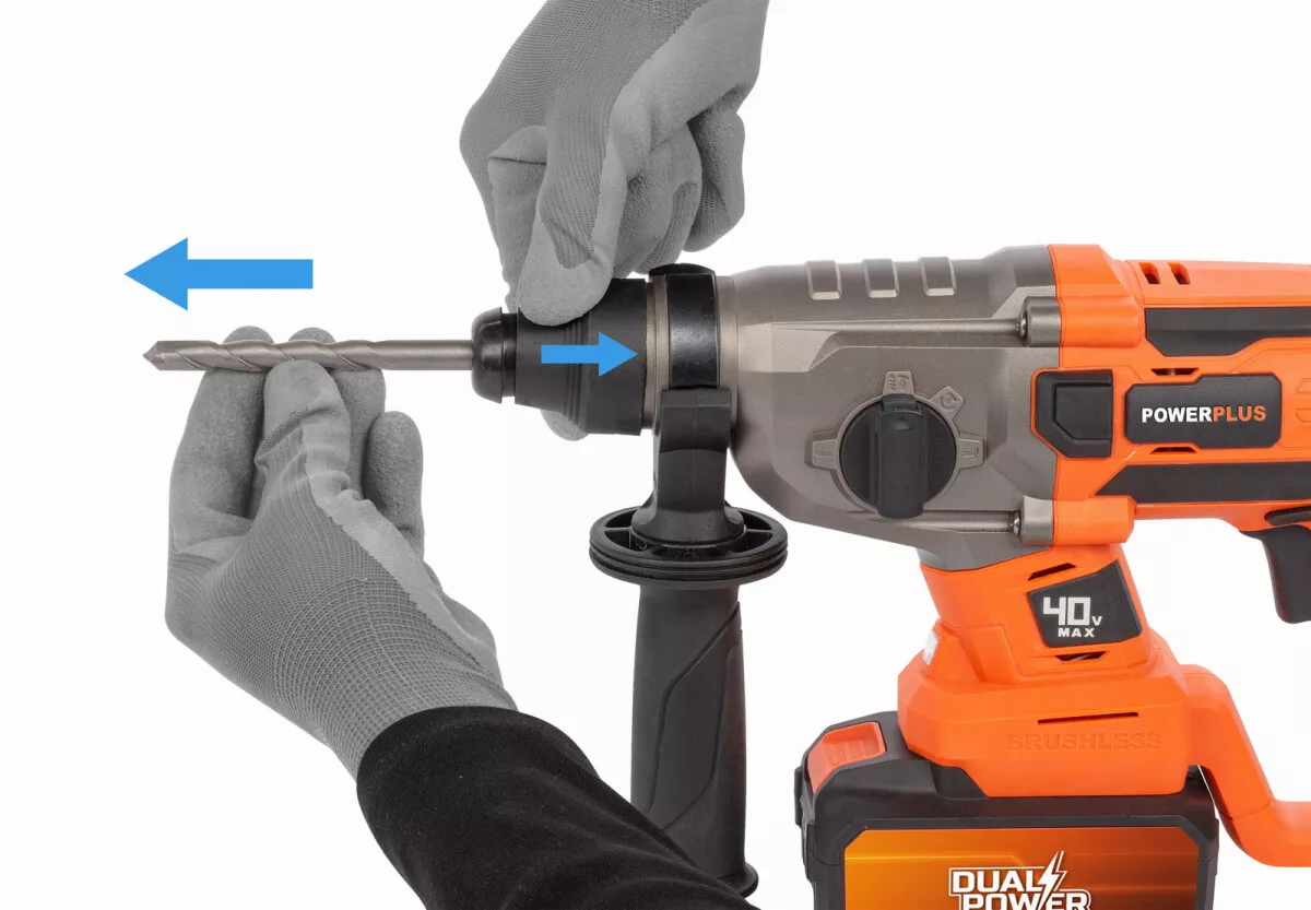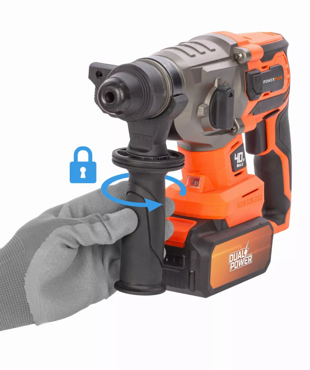 - Toto aku vrtací kladivo 40V POWDP15680 od společnosti Powerplus nabízí 4 různé funkce: vrtání, příklepové vrtání, sekání a otáčení sekáče.