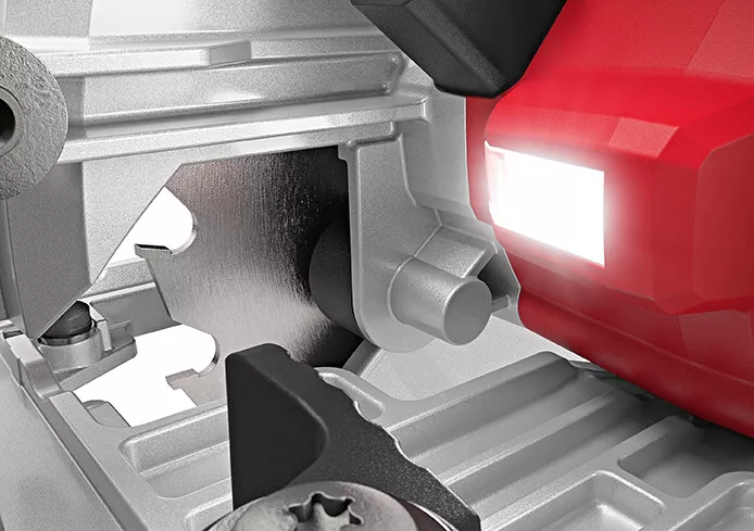 - Dvojitě uchycený výkyvný systém zabraňuje pohybu pilového kotouče při řezu v pokosu a tím nebezpečnému záseku