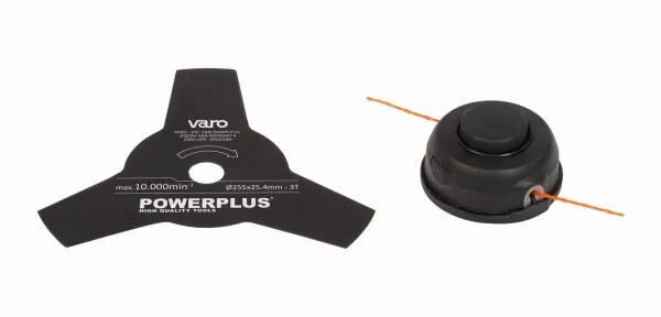 - Na křoviny máte k dispozici řezný kotouč 255mm a na trávu strunovou hlavu s 5m dlouhou strunou o průměru 2mm a záběrem 320mm (obojí je součástí balení).