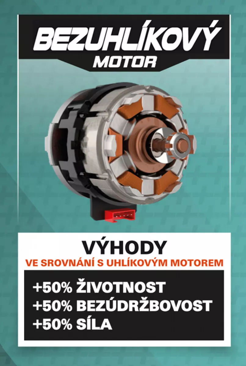 - Bezuhlíkový motor je výkonný a odolný s nižšími vibracemi, menšími nároky na údržbu a delší životností.