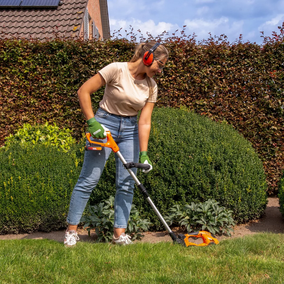 - Při použití nůžek na trávu / keře s teleskopickou hřídelí pomáhají kolečka vést nářadí podél okrajů trávy.