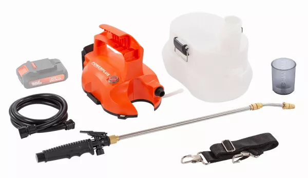 - Akumulátorový 20V postřikovač poskytuje konstantní tlak 5 barů a průtok 500 ml za minutu.