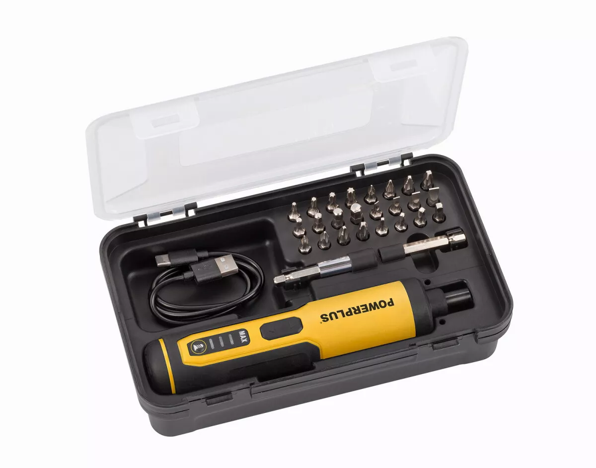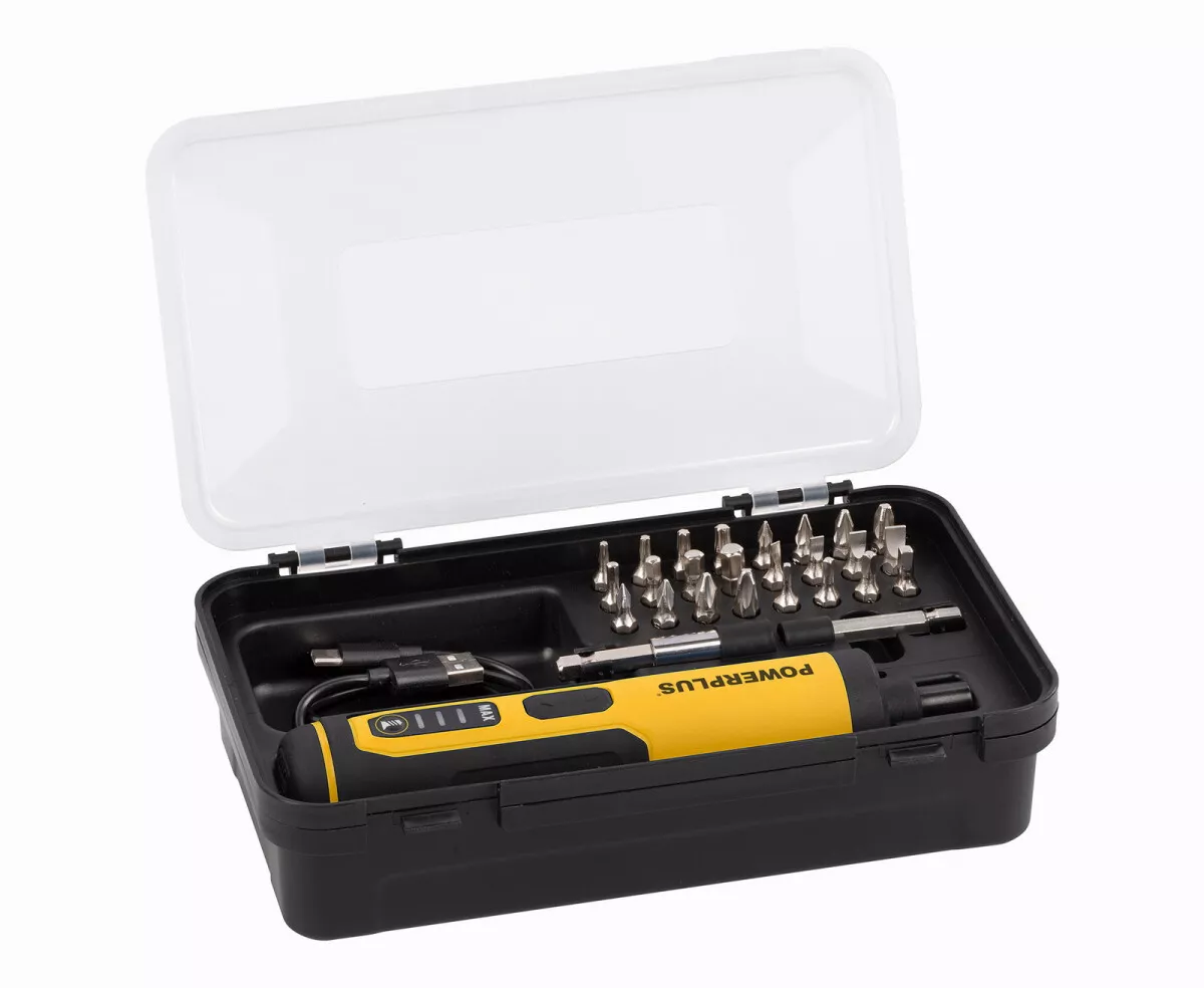 - Nejen, že je tento kompaktní šroubovák dodáván v praktickém kufříku, ale také obsahuje 25 šroubovacích bitů, takže se můžete bez prodlení pustit do práce.