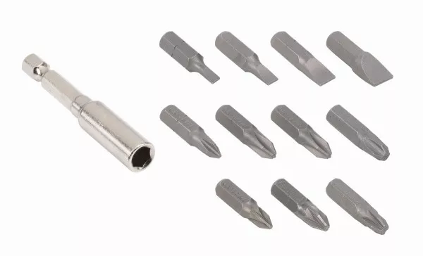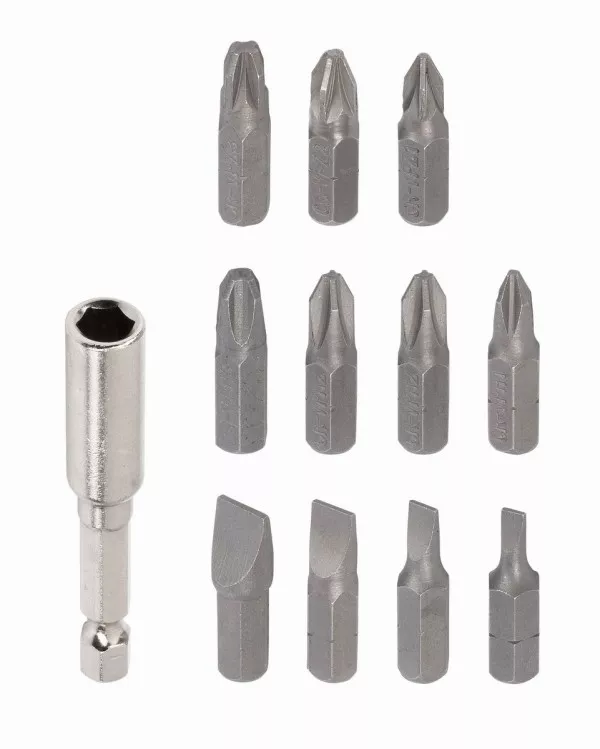 - 12x 25mm bitů (PZ1/PZ2/PZ2/PZ3/PH1/PH2/PH2/PH3/SL3/SL4/SL6/SL8)