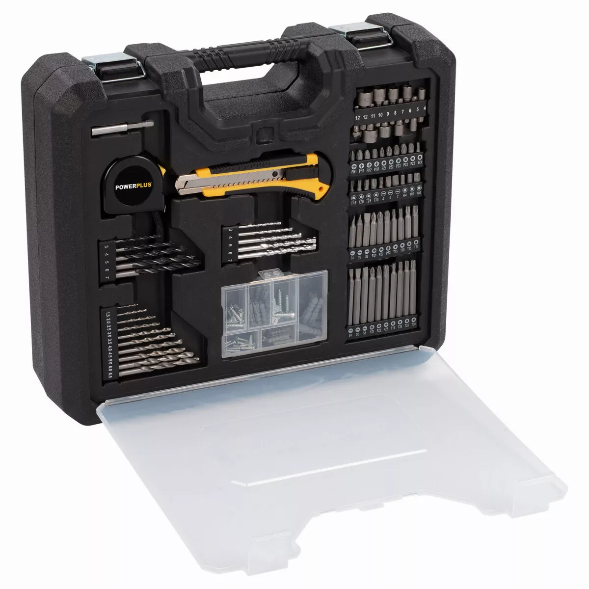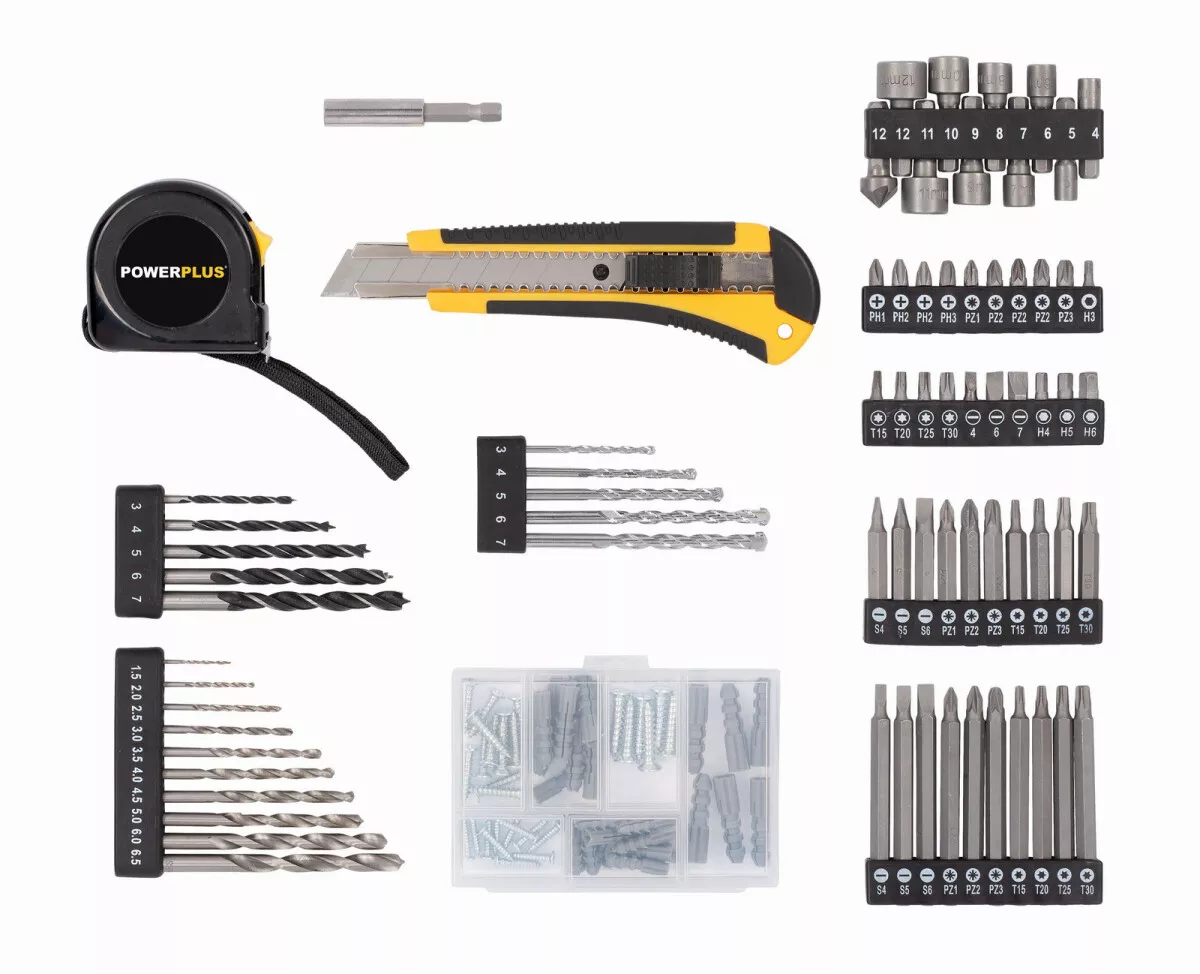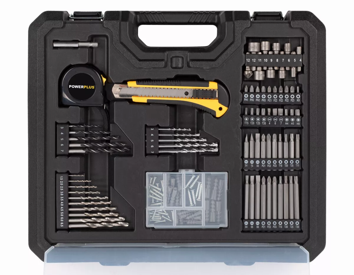 - Součástí je také rozsáhlá sada šroubovacích bitů a vrtáků, praktické ruční nástroje, jako je nůž a měřicí páska, a sada šroubů a hmoždinek.