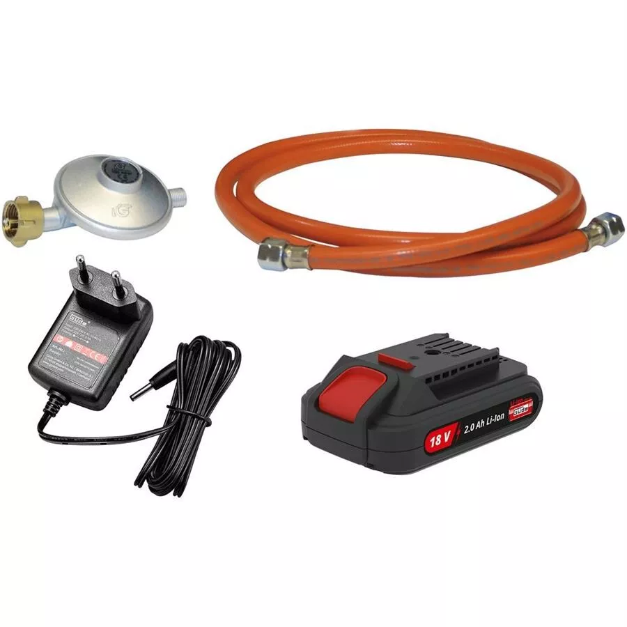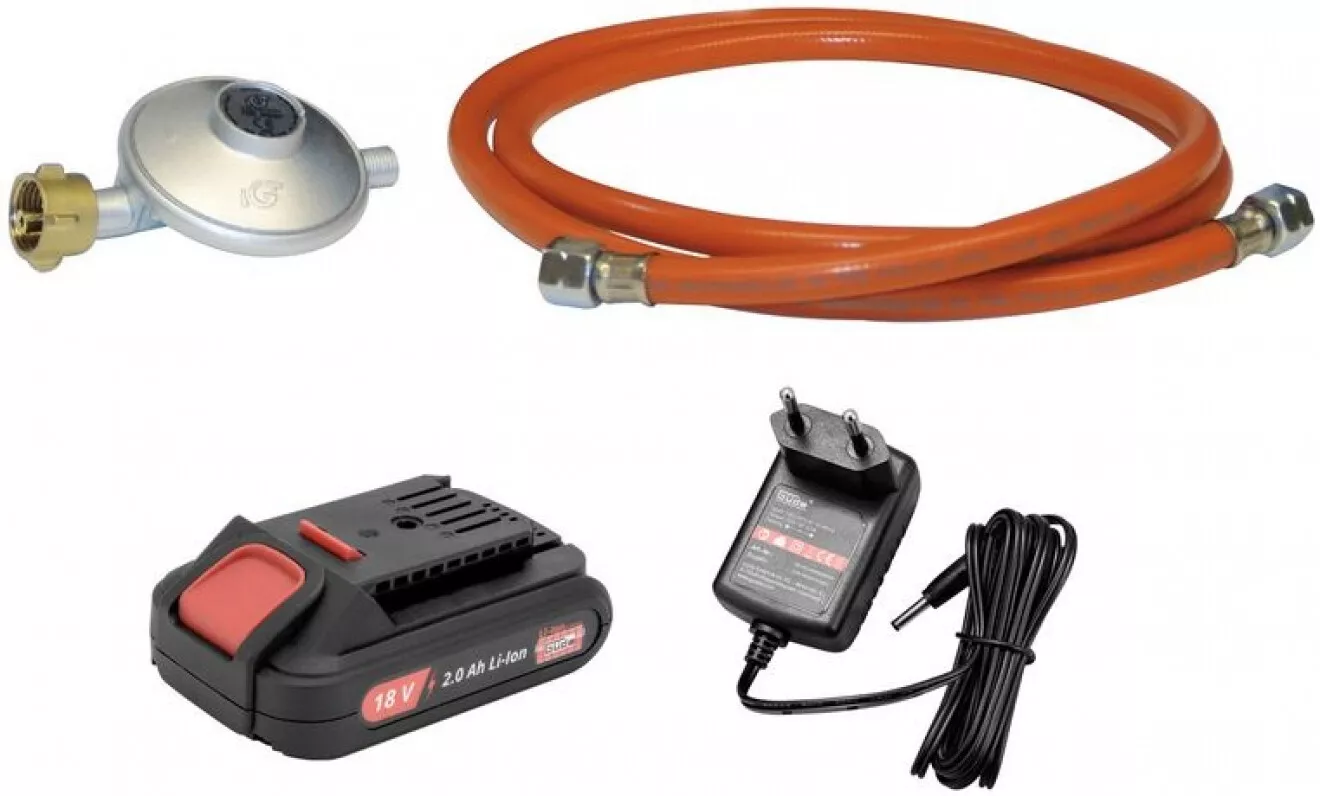 - spotřeba: 2,2 kg/hod) • délka pracovního cyklu při plném dobití baterie až 120 min.Horkovzdušný ventilátor (průtok vzduchu: 450 m3/hod) • ruční piezoelektrické zapalování • ochrana proti přehřátí.Konstrukce: plášť turbíny z oceli, plynový hořák z ušlechtilé oceli, stojný podstavec se skříňkou akumulátoru a ovládacími prvky, rukojeť pro přenášení.Příslušenství: nabíječka LG 18-05 I**, 1,5 m plynová hadice, redukční ventil, akumulátor AP 18-20 (58555).Celkové rozměry (d x š x v): 475 x 220 x 365 mm, ***topný výkon: 15.480 - 25.800 kcal/hod, stupeň krytí: IP X4