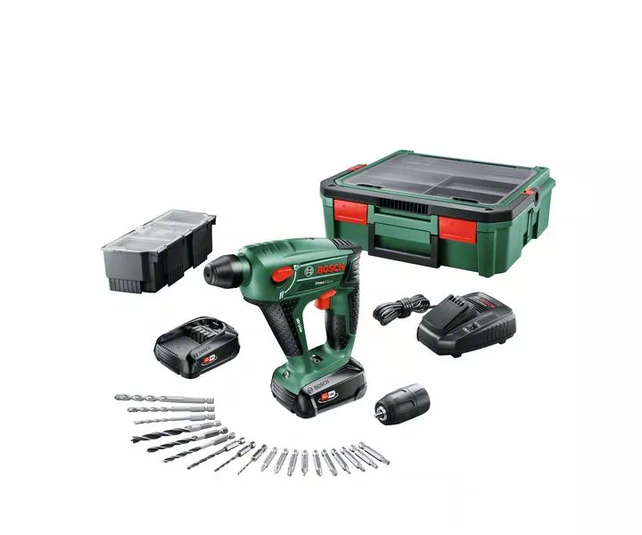 - Akumulátorové vrtací kladivo Uneo Maxx + SystemBox; Jedinečné akumulátorové nářadí 3 v 1 pro rozsáhlejší projekty; Pneumatický příklepový mechanismus pro snadné a rychlé vrtání (i do betonu); Rychloupínací sklíčidlo SDS quick pro intuitivní a snadnou výměnu příslušenství během 3 sekund; Kompaktní a výkonné pro optimální ovládání a výsledky; Vrtání s příklepem, vrtání a šroubování do betonu a zdiva, vrtání do dlaždic, dřeva a kovu; POWER FOR ALL – nízká hmotnost 1,4 kg s vyměnitelným akumulátorem 18 V; POWER FOR ALL: Jeden akumulátor a jedna nabíječka pro celý systém nářadí Home & Garden; 2× akumulátor PBA 18V 1.5Ah; Adaptér na kulaté stopky; 19dílná sada vrtáků a šroubovacích bitů Uneo (2 609 256 989); SystemBox; Nabíječka AL 1815 CV; Karton