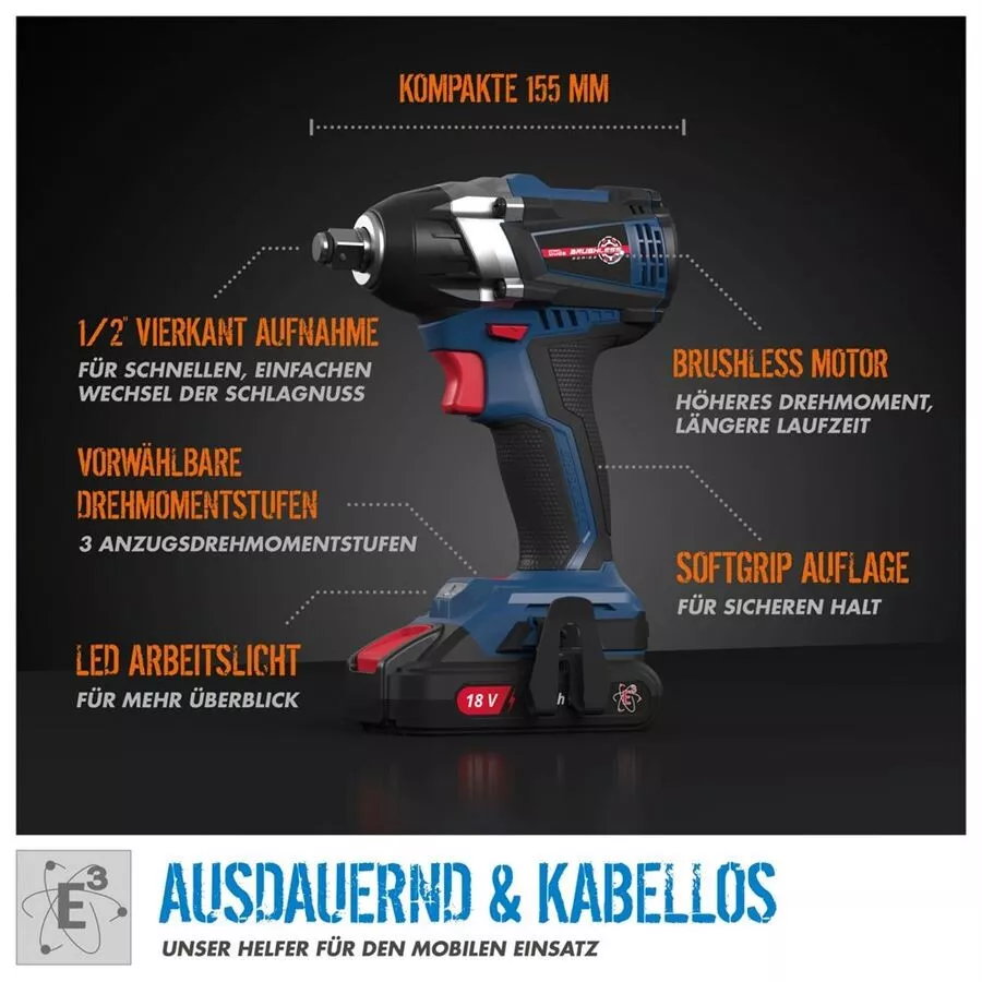 - Akumulátorový rázový utahovák ze série akumulátorového nářadí 18V E 3 . Praktický a výkonný, dlouhý pouhých 155 mm. Bezkartáčový motor pro lepší výkon a delší životnost. 1/2" čtyřhranné upínání s pružinovým kroužkem pro rychlou a snadnou výměnu nástroje