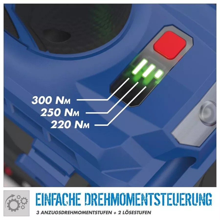 - 3 předvolitelné stupně utahovacího točivého momentu 220 | 250 | 300 Nm.2 předvolitelné stupně/rychlosti uvolnění. Elektronika s regulací otáček a ochranou proti přetížení