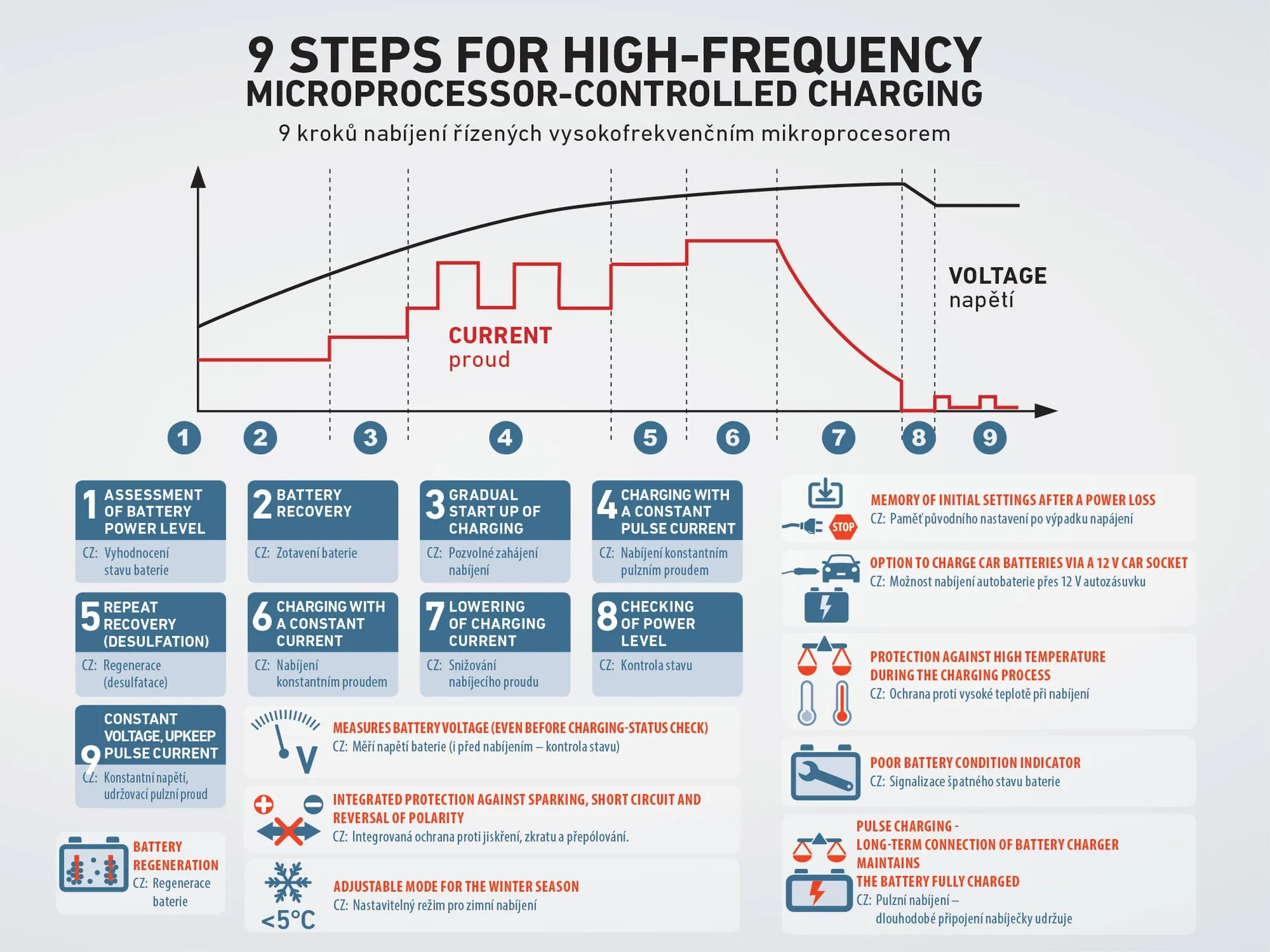 - Nabíječka je určena pro nabíjení 12V nebo 6V olověných akumulátorů se zaplavenou elektrodou WET i Calcium, MF VRLA akumulátorů, AGM, i gelových a 12V LiFePO4 akumulátorů. Pro svou práci využívají automatický přepínací mód o vysoké frekvenci. Vestavěný mikroprocesor v naprogramovaných 9fázích procesu zajistí nabití baterií až do 100% jejich originální kapacity. Po zapnutí nabíječky a připojení na akumulátor uvidíte na displeji jeho napětí a můžete si zvolit jestli nabíjíte 12V baterii v autě, motocyklu, v zimě, LiFePO4 nebo 6V baterii. Pokud se při nabíjení detekuje částečně sulfátovaná baterie, zapne se automaticky funkci desulfatace baterie, která obnovuje její kapacitu. Nabíječka má ochranu proti přebíjení, přehřátí, zkratu, přepólování. Při výpadku napájení si zapamatuje nastavený typ nabíjení a po opětovném zapnutí ho nastaví. Nabíječka je velmi flexibilní ve způsobu připojení baterií a je vybavena 4různými koncovkami: klasické krokosvorky, očka, SAE konektor a 12V autozásuvka. 9 nabíjecích stupňů 1-vyhodnocení stavu baterie2-zotavení baterie3-pozvolné zahájení nabíjení4-nabíjení konstantním pulzním proudem5-regenerace(desulfatace)6-nabíjení konstantním proudem7-snižování nabíjecího proudu8-kontrola stavu9-konstantní napětí, udržovací pulzní proud