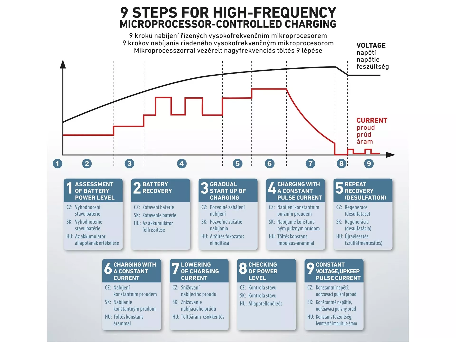 - Nabíječka je určena pro nabíjení 12V olověných akumulátorů se zaplavenou elektrodou WET i Calcium, MF VRLA akumulátorů, AGM, i gelových v rozsahu jmenovité kapacity baterií 1,2 – 80Ah. Pro svou práci využívají automatický přepínací mód o vysoké frekvenci. Vestavěný mikroprocesor v naprogramovaných devíti fází procesu zajistí nabití baterií až do 100% jejich originální kapacity. Umožňuje automaticky (nebo volitelně) znovuoživení částečně sulfátovaných baterií. Nabíjí a zachraňuje vyčerpané baterie. V automatickém udržovacím módu dodává bateriím pouze tolik potřebné energie, která se rovná jejímu samovybíjecímu proudu, takže umožní uživateli ponechat baterii spojenou s nabíječkou i po několik měsíců a udržet ji ve stále plném stavu nabití.9 nabíjecích stupňů1-vyhodnocení stavu baterie2-zotavení baterie3-pozvolné zahájení nabíjení4-nabíjení konstantním pulzním proudem5-regenerace(desulfatace)6-nabíjení konstantním proudem7-snižování nabíjecího proudu8-kontrola stavu9-konstantní napětí, udržovací pulzní proud