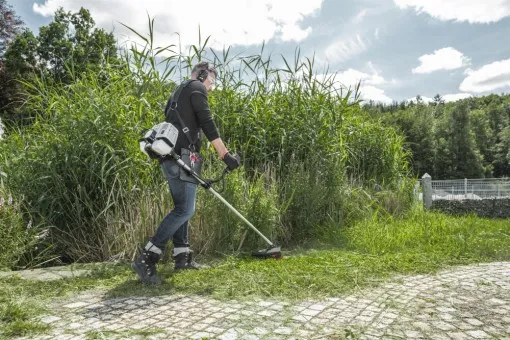 - Pro vaši bezpečnost a životní prostředí: Navzdory svému výkonnému benzínovému motoru je BC 500 B snadno a bezpečně použitelný, zejména pro hobby zahrádkáře a začátečníky, díky jeho ergonomickému designu, optimálnímu rozložení hmotnosti a pohodlnému držadlu a nosným prvkům. Stabilní a odolná ochrana kovové nádrže chrání před poškozením a spolehlivě zabraňuje úniku benzínu.