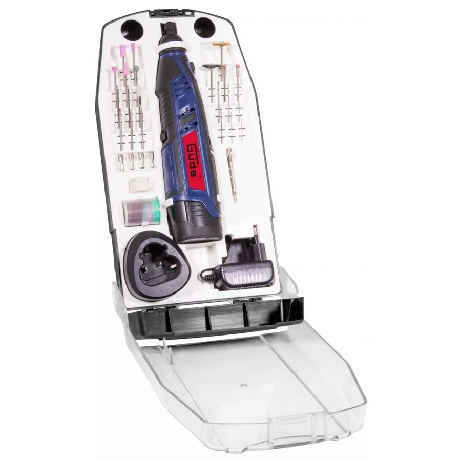 - Vybavení: Li-Ion akumulátor 12 V/1,3 Ah; nabíječka 0,35 A/h; sada nástrojů, 45dílná; transparentní úložná kazeta