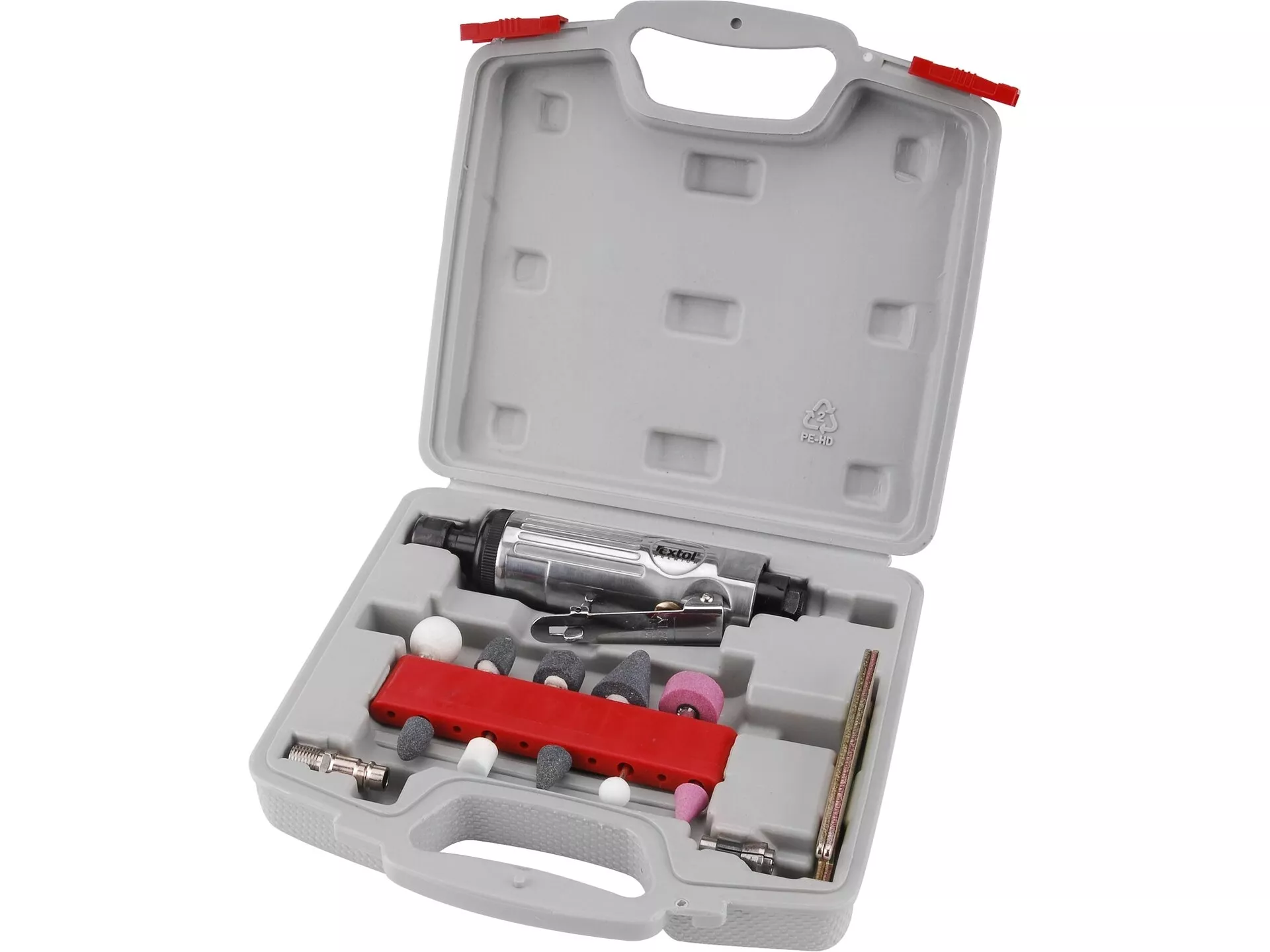 - Příslušenství: 2 upínací kleštiny, 10 brusných nástrojů, 2 montážní klíče, konektor pro rychlospojku, přepravní kufr