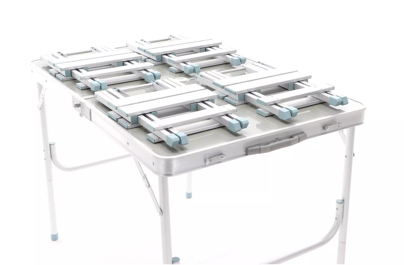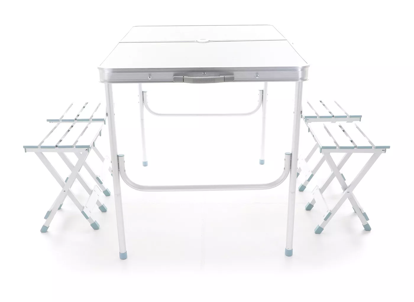 - Sestava je vyrobena z eloxovaneho hliniku, material desky stolu je z MDF, sedatka jsou z hliniku.