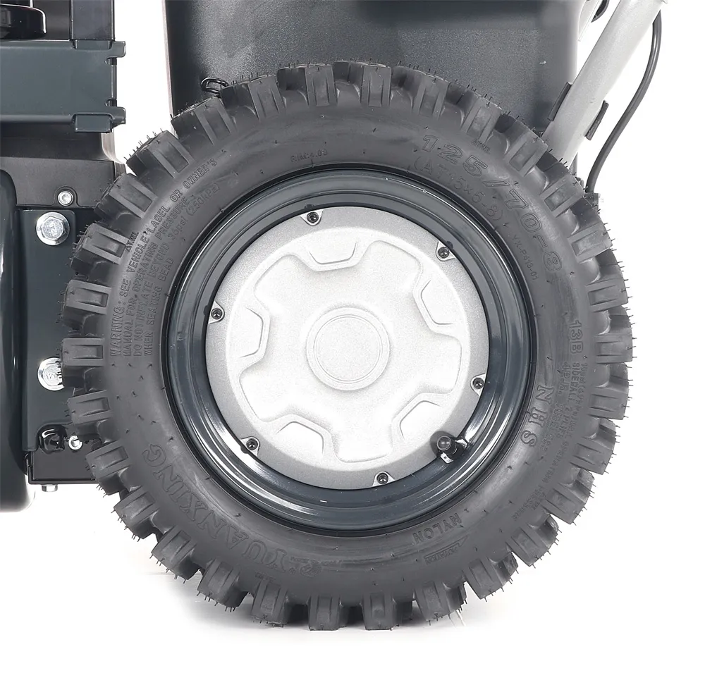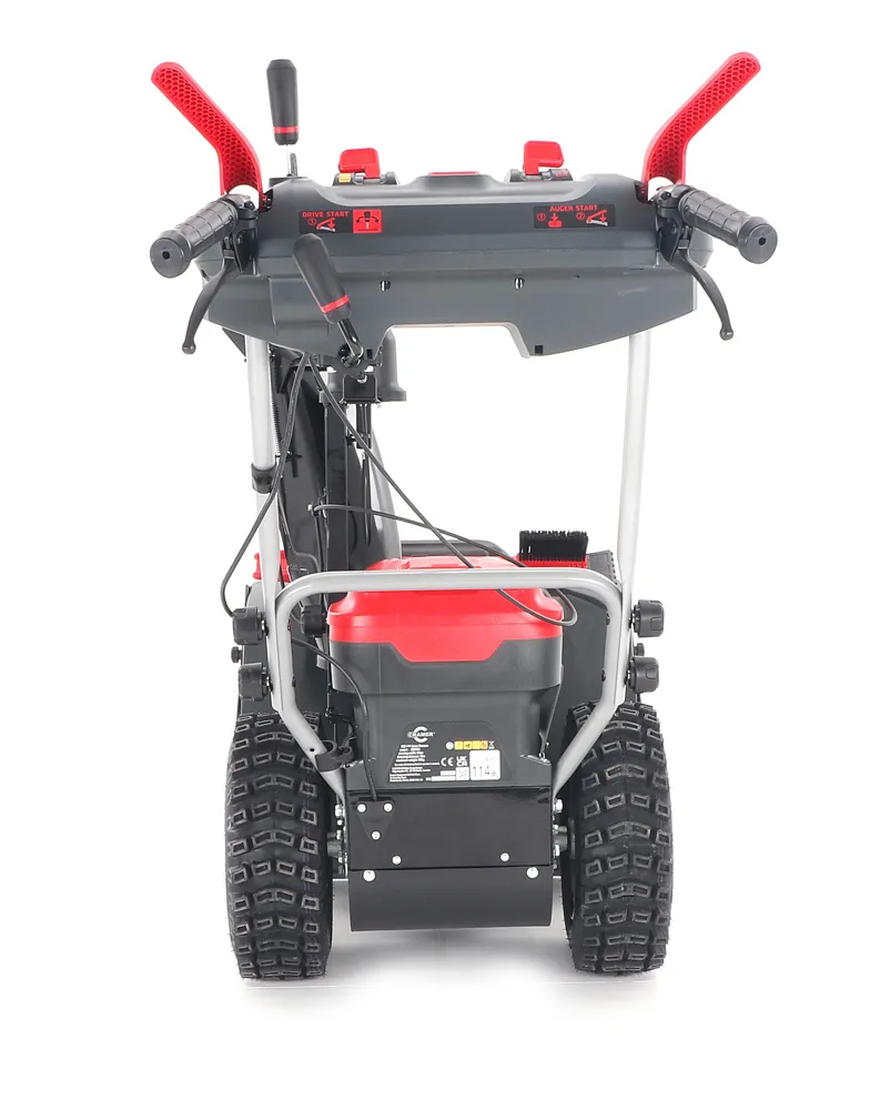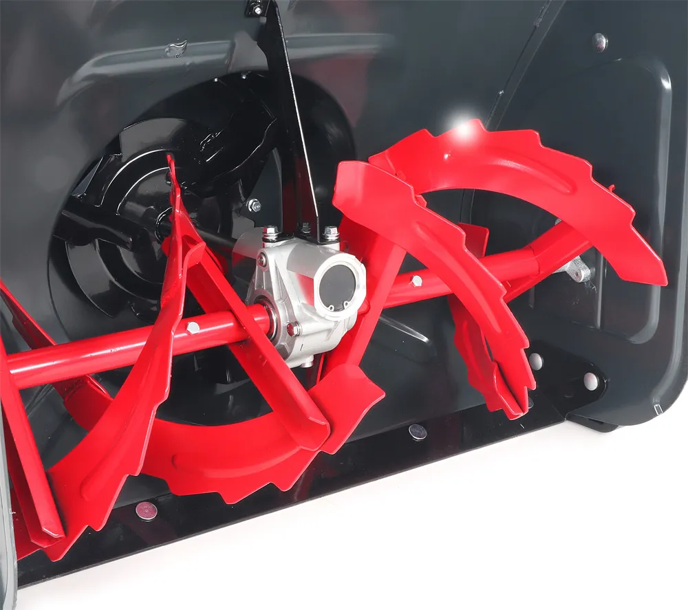 - - Dvoustupňový odhazovací systém se šnekem z kalené oceli pro nabírání sněhu do přední části stroje a vysoce účinná turbína odhazuje nasbíraný sníh vyhazovacím komínkem