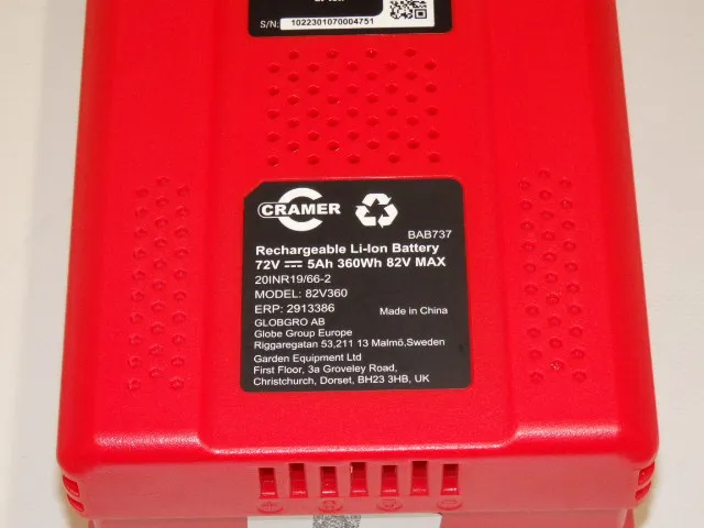 - Cramer 82V360 je robustní 82V 5Ah lithium-iontová baterie. Je vybaven pokročilou technologií článků a integrovaným LED indikátorem napájení s displejem zobrazující stav nabití v % kompatibilní se systémem Cramer Fleet Management přes Bluetooth, který jasně ukazuje úroveň výkonu a kdy je vyžadováno nabíjení.