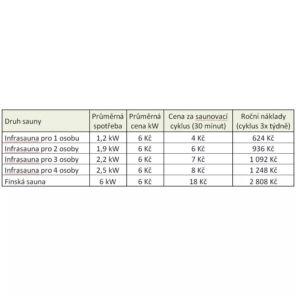 - Infrasauny jsou energeticky nenáročné spotřebiče , náklady na energii se pohybují v závislosti na velikosti infrasauny pro každý Váš pobyt v infrasauně okolo 4 - 8 Kč. Záleží na velikosti a kapacitě infrasauny, čím větší infrasauna, tím vyšší výkon potřebuje. Níže naleznete tabulku uvádějící průměrnou spotřebu a přibližnou cenu za saunovací cyklus daného typu infrasauny.
