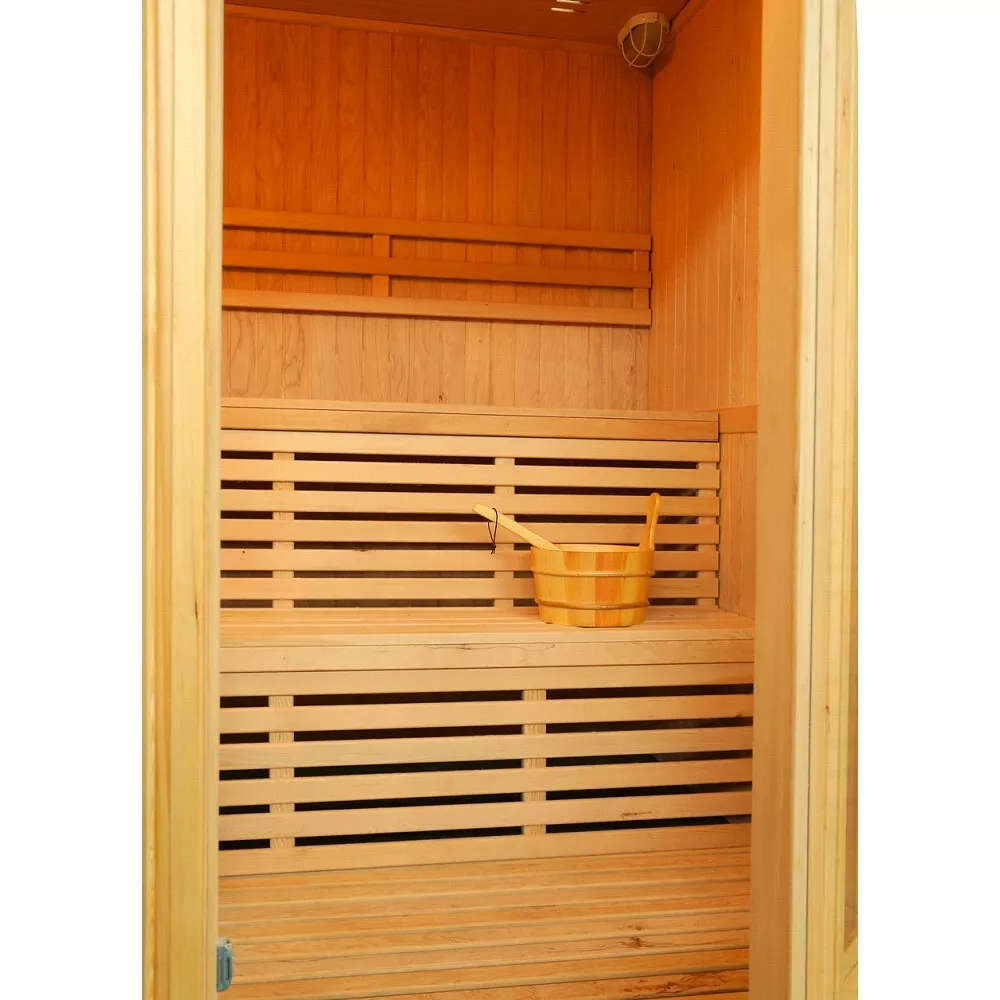 - Sauna je navržena tak, aby člověk vydržel po delší dobu (10-15 minut) i vysoké teploty. To je umožněné díky vysokému suchu uvnitř sauny. Díky vysoké teplotě dochází k lepšímu prokrvení těla, čímž se uvolňují svaly, zlepšuje se průchodnost cév a uvolňují se z těla endorfiny. Saunování má také blahodárný účinek na problémy s křečemi, bolesti kloubů, bolesti hlavy a jak již bylo řečeno sauna má velmi pozitivní účinek na činnost srdce a na tvorbu imunitních látek. Spojení všech těchto účinků napomáhá sauna k uvolňování stresu a celkovému zlepšení jak zdravotního stavu, tak psychické kondice.
