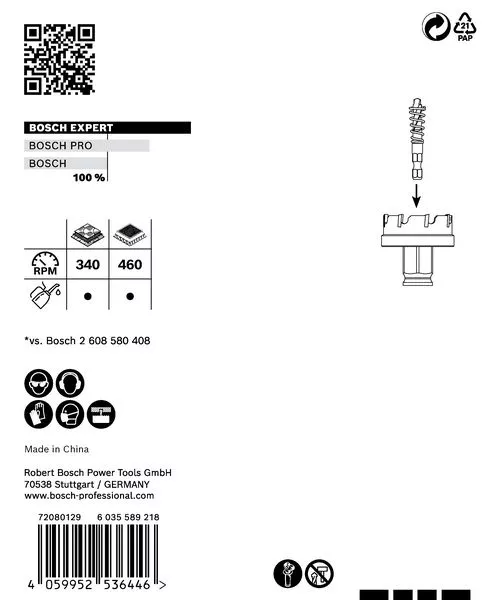 - Text s tvrzením o výkonnosti: Při vrtání odolných materiálů vydrží až 50× déle než děrovka Bosch 2608580408