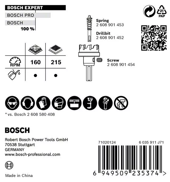 - Text s tvrzením o výkonnosti: Při vrtání odolných materiálů vydrží až 50× déle než děrovka Bosch 2608580408