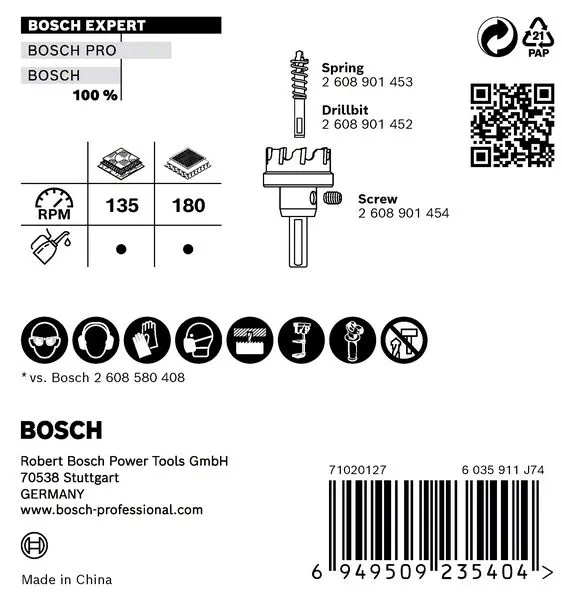 - Text s tvrzením o výkonnosti: Při vrtání odolných materiálů vydrží až 50× déle než děrovka Bosch 2608580408