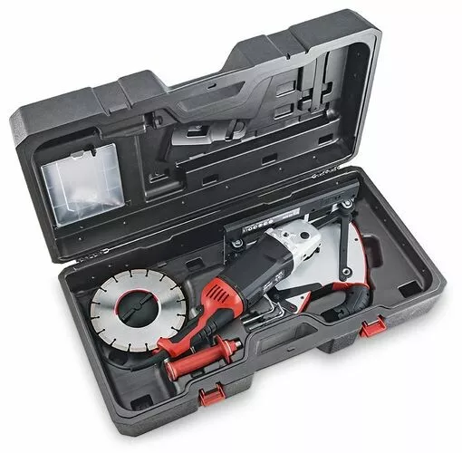 - K okamžitému použití, úhlová bruska s již namontovaným odsávacím krytem v kufru. Včetně diamantového řezacího kotouče Diamantjet standart na beton 230 mm