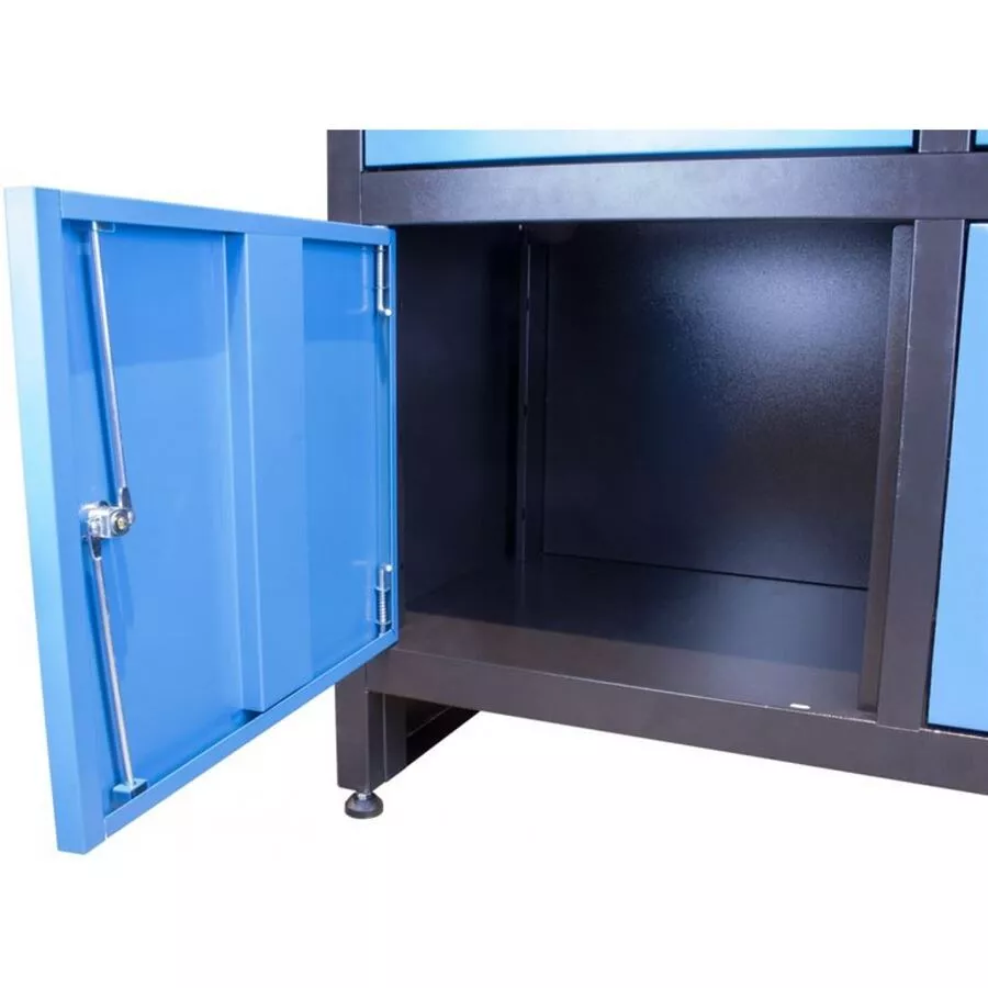 - Konstrukce: ocelový rám, podnoží včetně 6 nastavitelných patek (k vyrovnání případných nerovností podlahy), barevné provedení: RAL 9005 (korpus), RAL 5015 (zásuvky, dvířka)