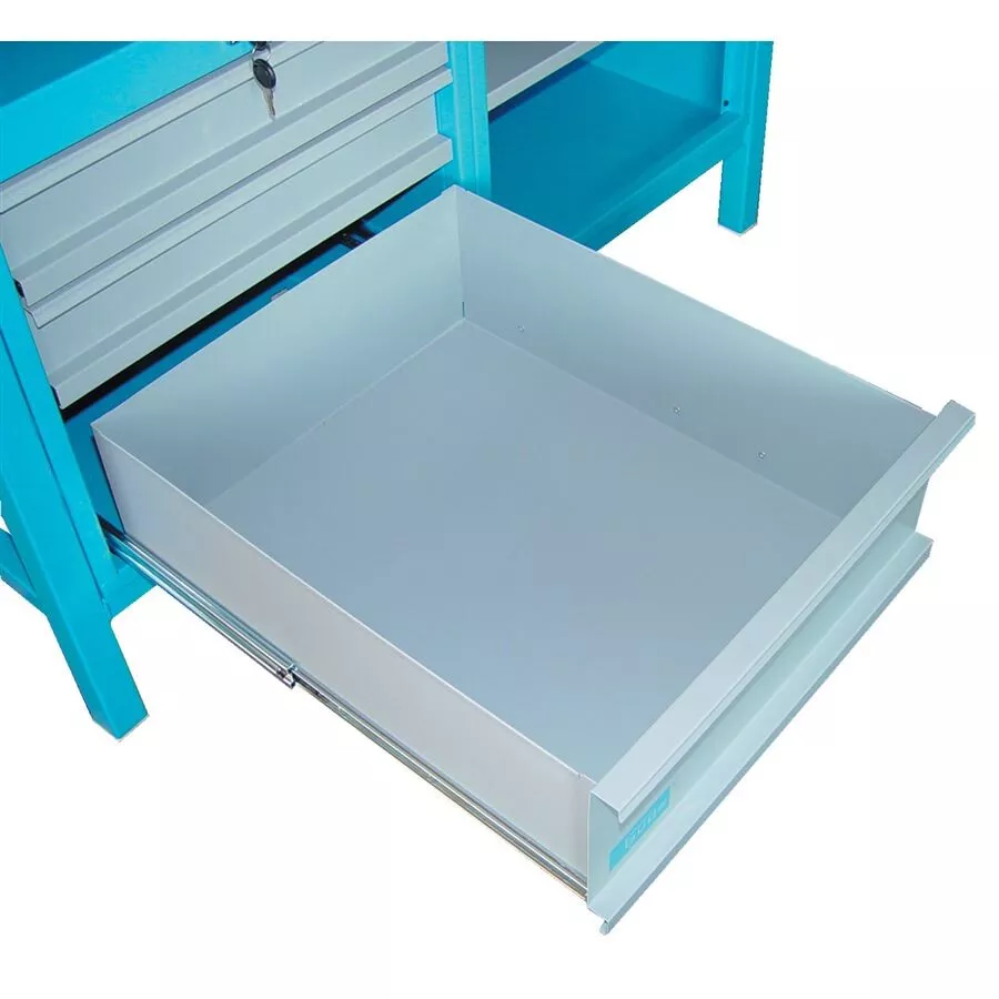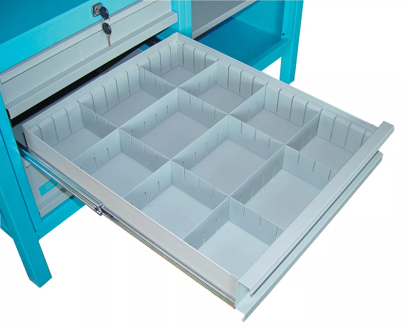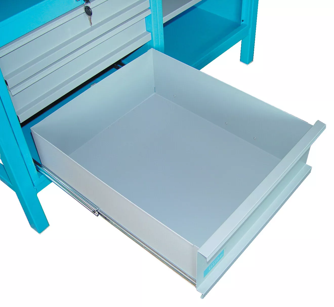 - Vybavení: 3-zásuvková uzamykatelná skříňka (2 zásuvky - výška: 85 mm/1 zásuvka - výška: 165 mm; centrální uzamykání cylindrickým zámkem - 2 klíče; úplný rozsah vyložení všech zásuvek v celé délce; pohyb zásuvek v profesionálních vodicích lištách; vrchní zásuvky připraveny pro použití vnitřních dělicích příček)