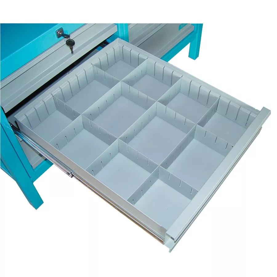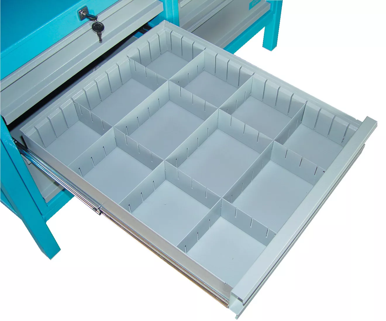 - Vybavení: 2 zásuvkové díly se 3 zásuvkami (2/2 vrchní menší zásuvky, rozměry š x h x v: 430 x 520 x 85 mm, včetně univerzálně nastavitelných přihrádek: 3 podélné/3 příčné dělicí příčky); spodní velké zásuvky (-> 1/1, rozměry š x h x v: 430 x 520 x 165 mm)