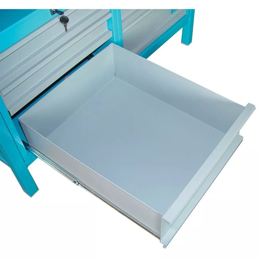- Oba zásuvkové díly samostatně centrálně uzamykatelné (-> cylindrický zámek, 2/2 klíče), pohyb zásuvek v profesionálních vodicích lištách (-> kuličková ložiska), úplný rozsah vyložení v celé délce