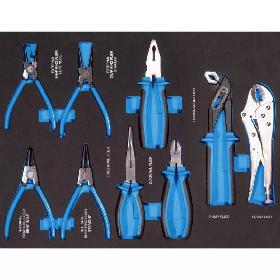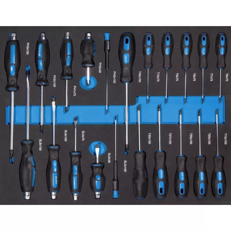 - TW 1000 - dílenský vozík s nářadím, 7 zásuvek, 263 dílůScheppach TW 1000 je profesionální celokovový dílenský vozík vhodný do domácích i řemeslných dílen, garáží, servisů apod. Vyznačuje se velmi tuhou konstrukcí, opláštěním hran vozíku tvrzeným plastem, pracovní deskou z odolného plastu s prolisy pro uložení drobného materiálu a s nízkým ochranným lemem, který udrží vaše nářadí vždy na místě. Pro snadnou manipulaci s vozíkem slouží dvě transportní měkčená madla a čtyři velká kola. Ty jsou pogumovaná a dvě z nich jsou plně otočná s integrovanou brzdou. Špičkovou kvalitu poznáte i podle snadné manipulace se zásuvkami. Ty jsou vybaveny velmi robustními a kvalitními pojezdy, takže se s nimi snadno manipuluje i při plném zatížení. Samozřejmostí je mechanismus bránící jejich samovolnému otevření a rovněž zámek, který chrání obsah před přístupem nepovolaných osob. Boční stěny vozíku jsou vybaveny děrovanou deskou, na kterou lze navěsit další nářadí nebo vhodné držáky či poličky. Čtyři zásuvky jsou vybaveny kvalitním běžně používaným nářadím (gola sady, kleště, různé druhy šroubováků, kladiva, klíče, elektrikářské díly apod.), zbylé tři zásuvky si můžete dovybavit nářadím dle svých požadavků. Každý kus nářadí má přesně stanovené místo a bude tak vždy a rychle po ruce.Obsah přihrádek: 1)Kladivo 0,5 kgGumová palička O 35 mm 2)Stranové klíče 12 ks 3)Ploché šroubováky 6 ks(PH2x38, PH0x75, PH1x100, PH2x100, PH2x150, PH3x200) 4)Segrové kleště vnitřní 2ks (rovné, zahnuté)Segrové kleště vnější 2ks (rovné, zahnuté) 5)Štípací kleště bočníProdloužené kleště rovnéKombinované kleště 6)17-ti dílná gola sada-ráčna 1/2"-kloubový nástavec 3v1-prodloužení 5"-prodloužení 10"-univerzální nástavec 1/2"-17 ks nástrčných klíčů 10-32 mm 7)13-ti dílná gola sada-ráčna 1/4"-kloubový nástavec 1/4"-prodloužení 2"-prodloužení 4"-univerzální nástavec 1/4"-šroubovák 1/4"-13 ks nástrčných klíčů 4-14 mm 8)Izolované elektrikářské šroubováky 6 ks( - 3x75, 4x100, 5,5x125, + PH0x75, PH1x100, PH2x100) 9)Hodinářské šroubováky 7 ks(PH0, PH00, PH000, 2x50, 2,5x50, 3x50) 10)THORX šroubováky 7 ks(T40, T30, T27, T25, T20, T15, T10) 11)Imbusové klíče s T rukojetí a kuličkou 6 ks(2x100, 2,5x100, 3x100, 4x150, 5x150, 6x150) 12)Křížové šroubováky 6 ks(3x75, 4x100, 5x100, 6x38, 6x150, 8x200) 13)Sada lisovacích kleští na kabelová oka s příslušenstvím-elektrikářské kleště 200 mm-160 ks příslušenství Technické údaje: Počet zásuvek: 7Výška zásuvek: 58/128/195 mmMax. zatížení: 450 kg