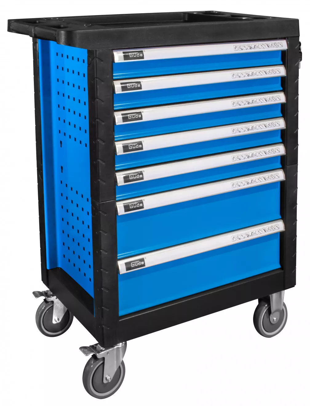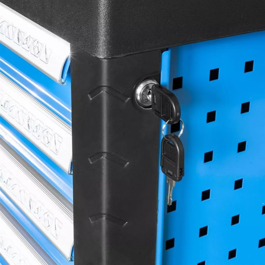 - 7 zásuvek na nářadí (rozměry d x š: 530 x 400 mm, výška: 2 x 140 mm, 5 x 60 mm; vybavení: teleskopické vodicí lišty, bezpečnostní pojistky proti neúmyslnému vysunutí, vnitřní štěrbinové dělení k rozčlenění prostoru děliči, centrální uzamykání cylindrickým zámkem)