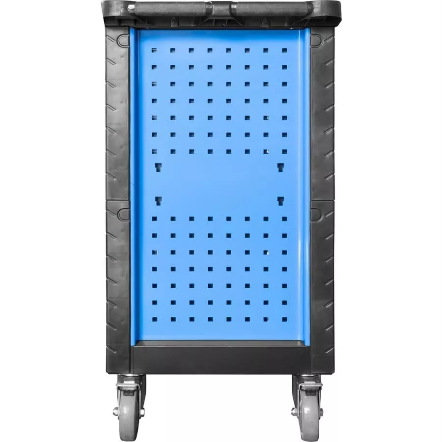 - Vrchní odkládací/pracovní plocha z tvrzeného plastu (se zvýšenými okraji/praktickými přihrádkami); děrované boční stěny pro upevnění závěsných držáků (Q-systém; otvory 1 cm2); svislé hrany vozíku vč