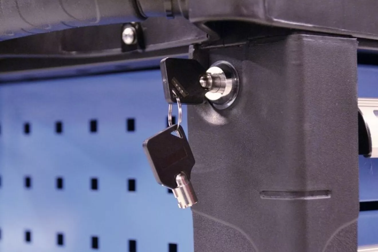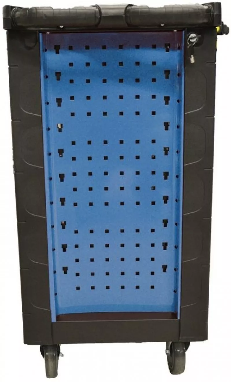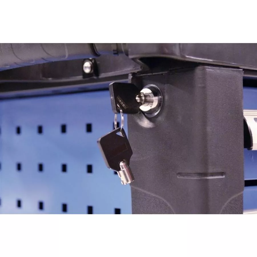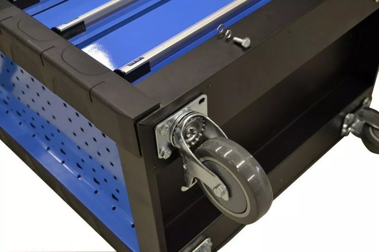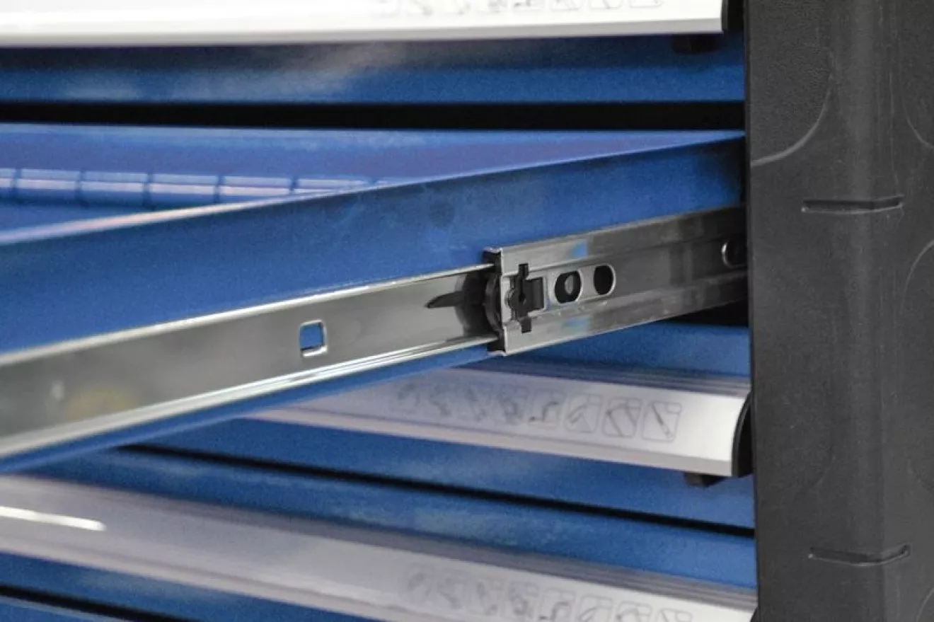 - 7 zásuvek na nářadí (-> rozměry d x š: 545 x 395 mm, výška: 1 x 135 mm, 1 x 150 mm, 5 x 75 mm; vybavení: teleskopické vodicí lišty, bezpečnostní pojistky proti neúmyslnému vysunutí, vnitřní štěrbinové dělení k rozčlenění prostoru děliči, centrální uzamykání cylindrickým zámkem)