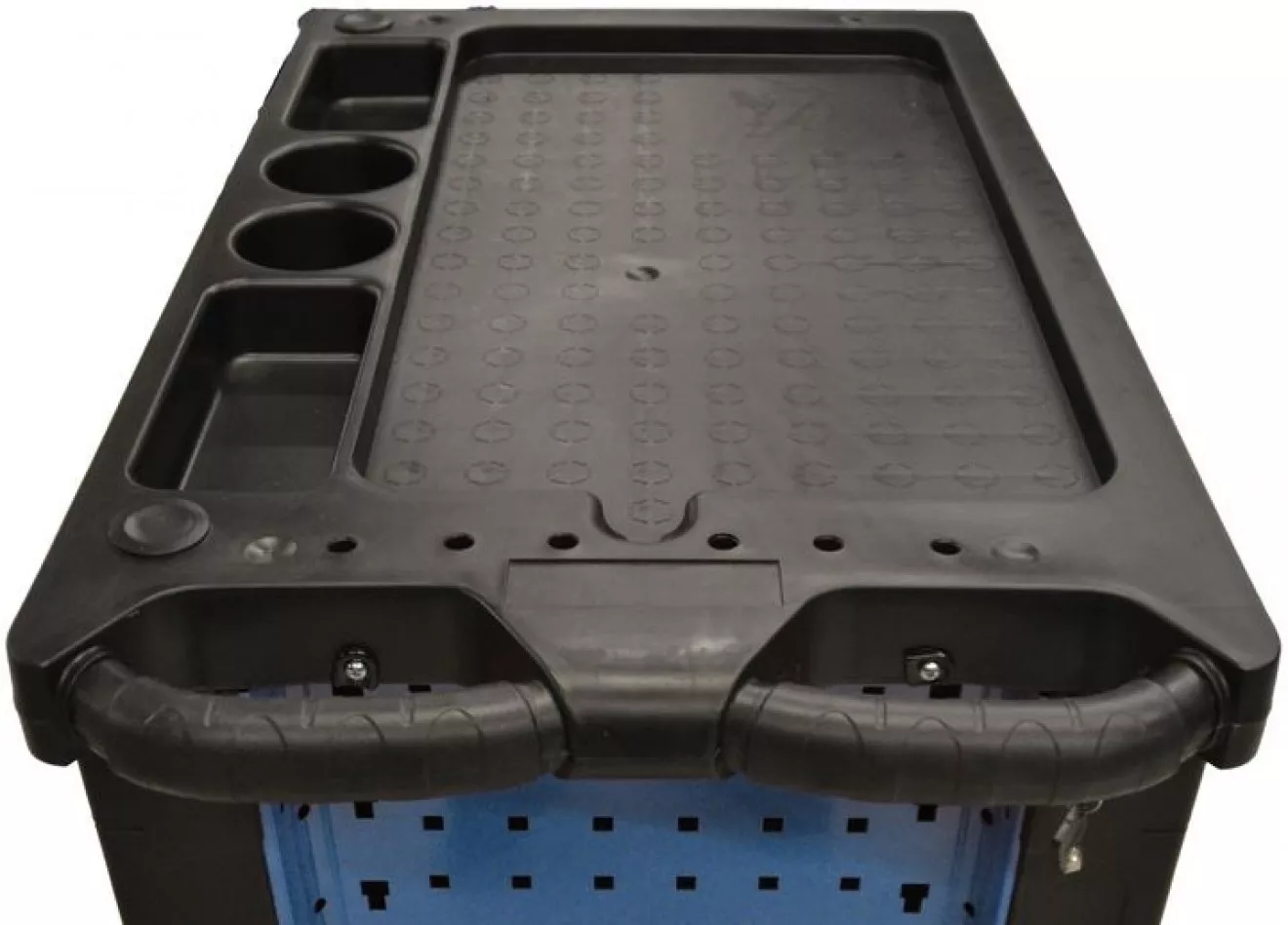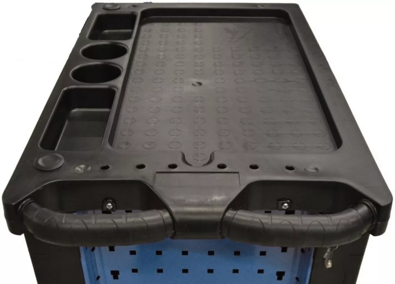 - Vrchní odkládací/pracovní plocha z tvrzeného plastu (-> se zvýšenými okraji/praktickými přihrádkami); děrované boční stěny pro upevnění závěsných držáků (-> Q-systém; otvory 10 mm2); hrany včetně ochranných lišt proti náhodnému poškození např