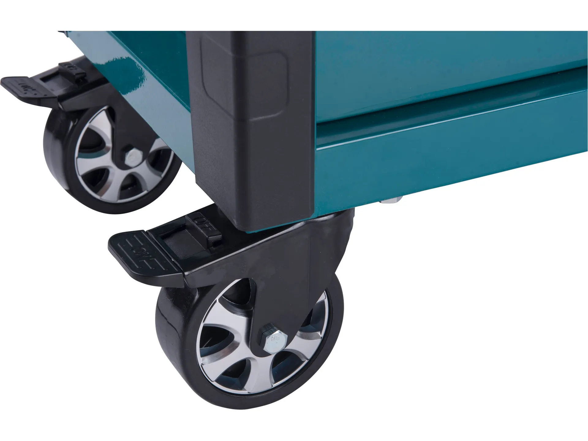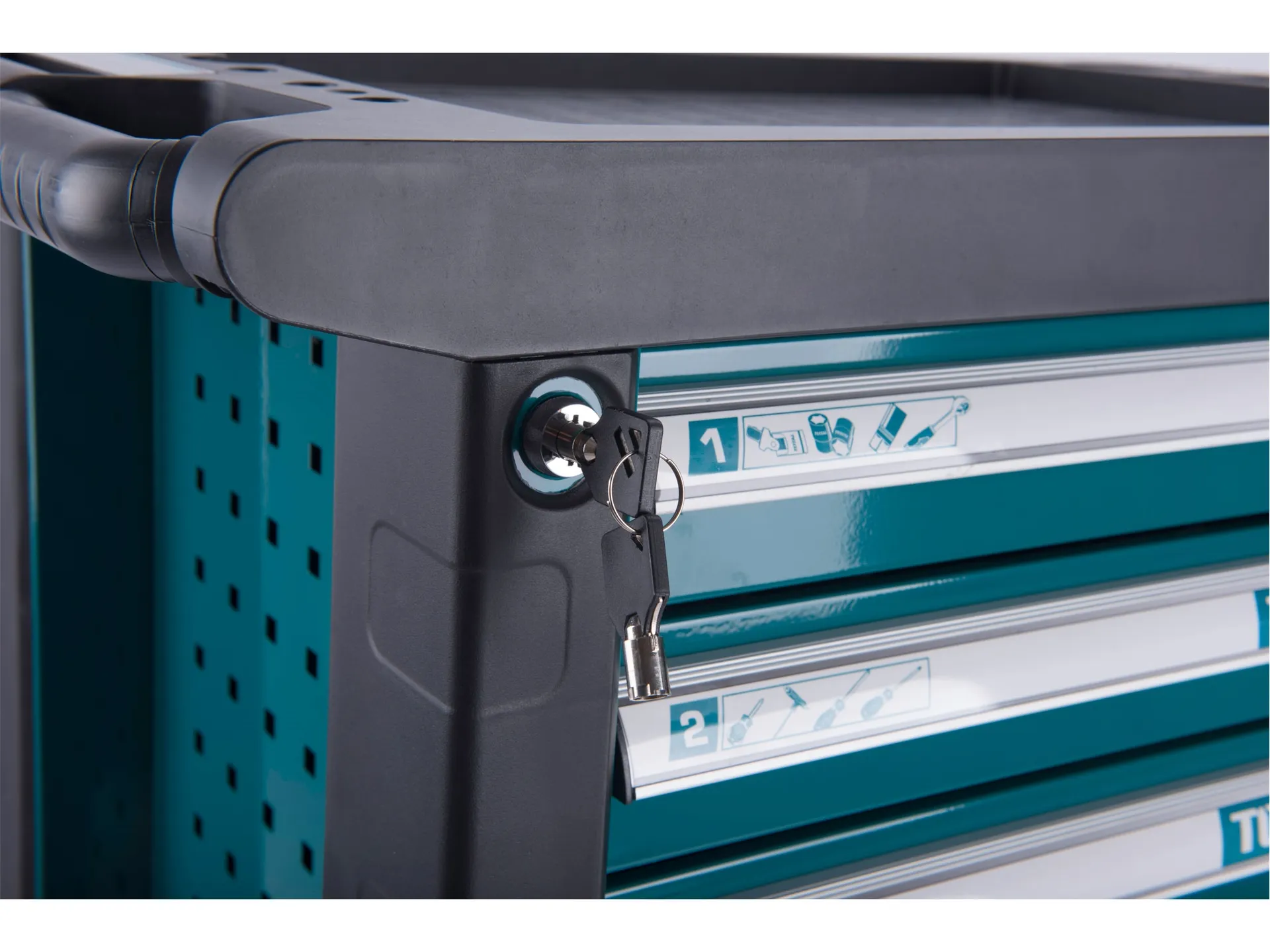 - Dílenský vozík obsahuje vysoce kvalitní nářadí z CrV oceli a dalších lepších slitin. Vozík obsahuje 7 šuplíků a má rozměry 765x465x812mm. Rozměry horních 5 šuplíků jsou 536x410x74,5mm. Spodní dva šuplíky jsou hlubší s rozměrem 536x410x153,5mm. Vozík je uzamykatelný jedním klíčem. Je vybaven brzdami na obě dvě zadní transportní kolečka. Pojezdy zásuvek s kulovými ložisky jsou vybaveny zarážkou proti celkovému výsuvu. Pro snadnou manipulaci je vozík nahoře vybaven úchopy pro ruce.