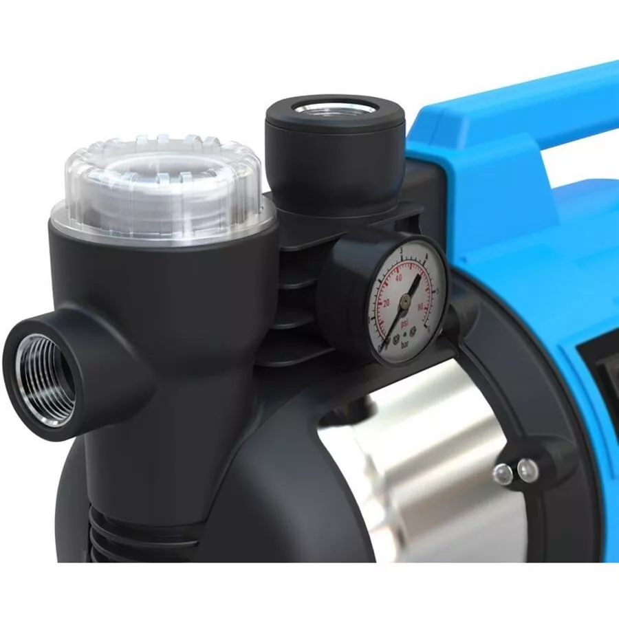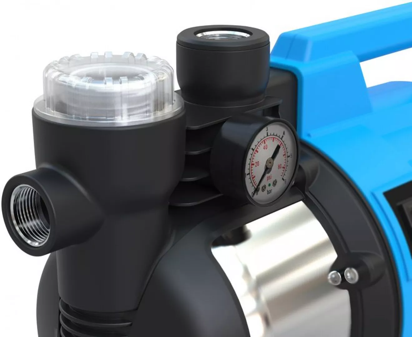 - Konstrukce: přípojky sacího i výtlačného vedení s kovovými závity, LED ukazatel, keramická ucpávka, manometr, rukojeť pro pohodlné přenášení.