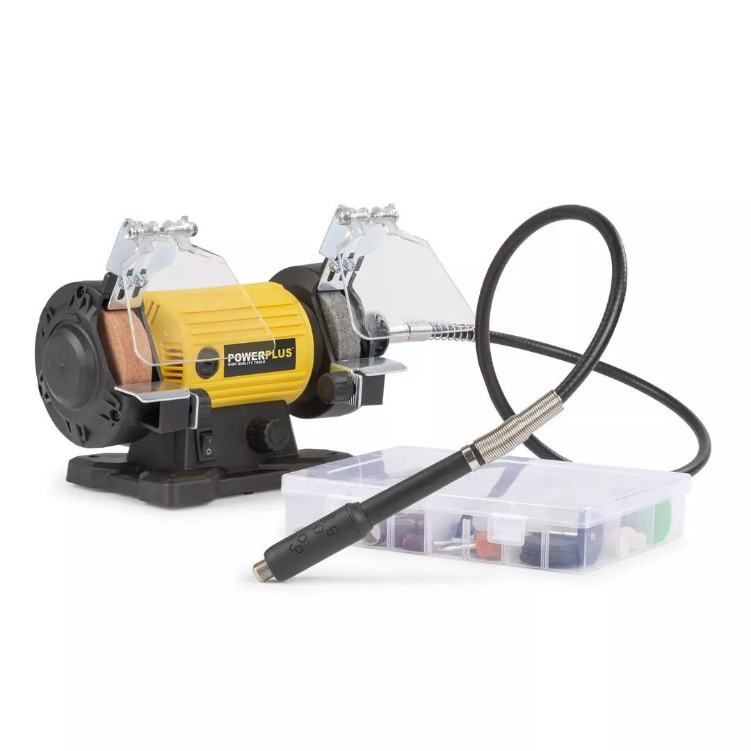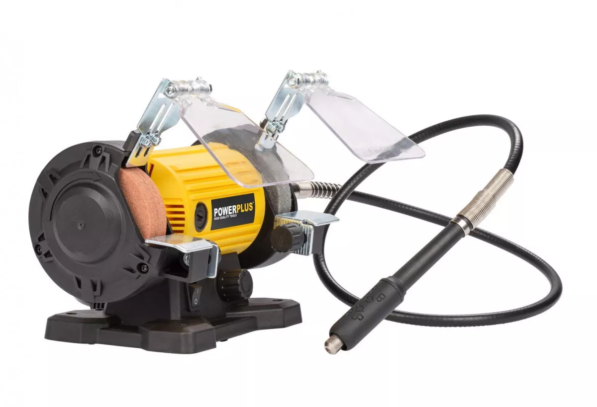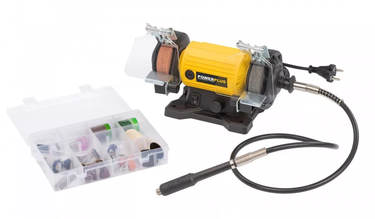 - Tato všestranná stolní bruska POWX1280 od Powerplus se dodává s brusným, lešticím kotoučem a také 103ks příslušenstvím pro ohebnou hřídel.